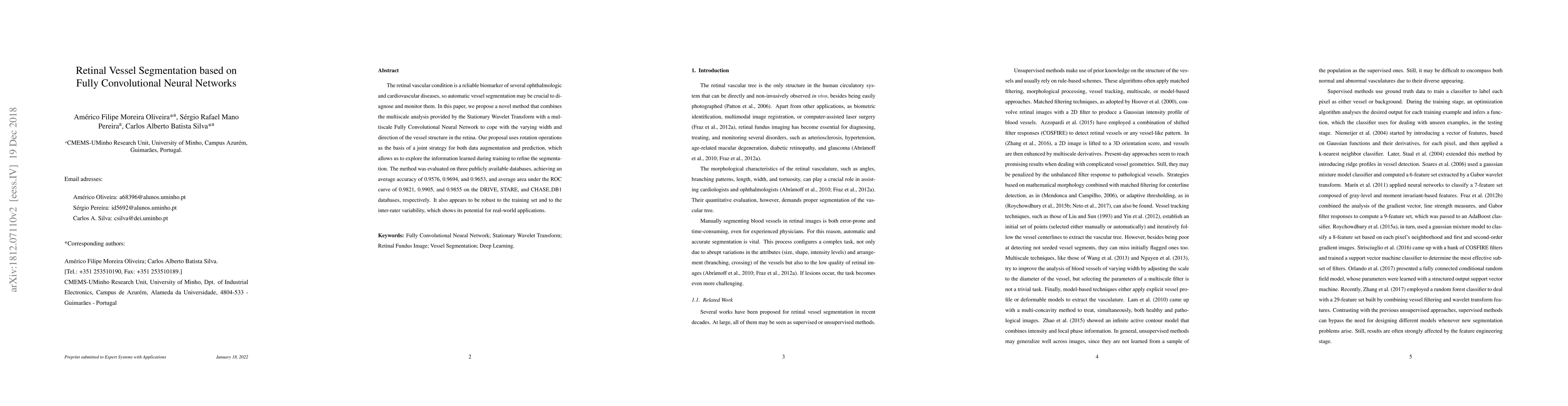 This paper proposes a method for retinal vessel segmentation using a combination of the Stationary Wavelet Transform and a multiscale Fully Convolutional Neural Network, achieving high accuracy on three public datasets. The approach leverages rotation operations for data augmentation and prediction refinement, demonstrating robustness and potential for real-world diagnostic applications.