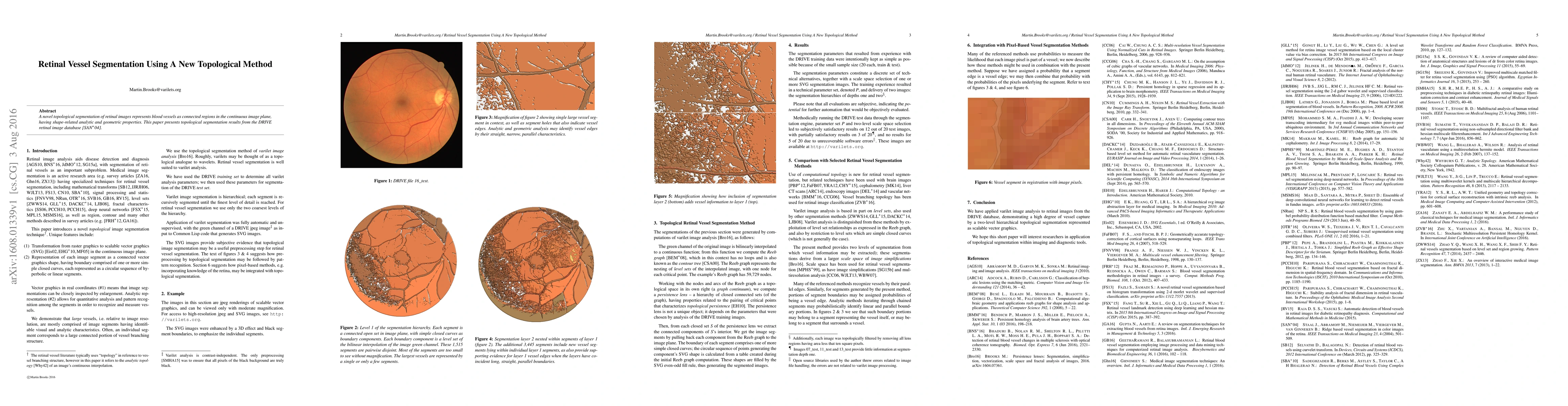 Summary: This paper introduces a new topological method for segmenting retinal blood vessels in images, representing them as connected regions with shape-related properties, and demonstrates its effectiveness using the DRIVE retinal image database.