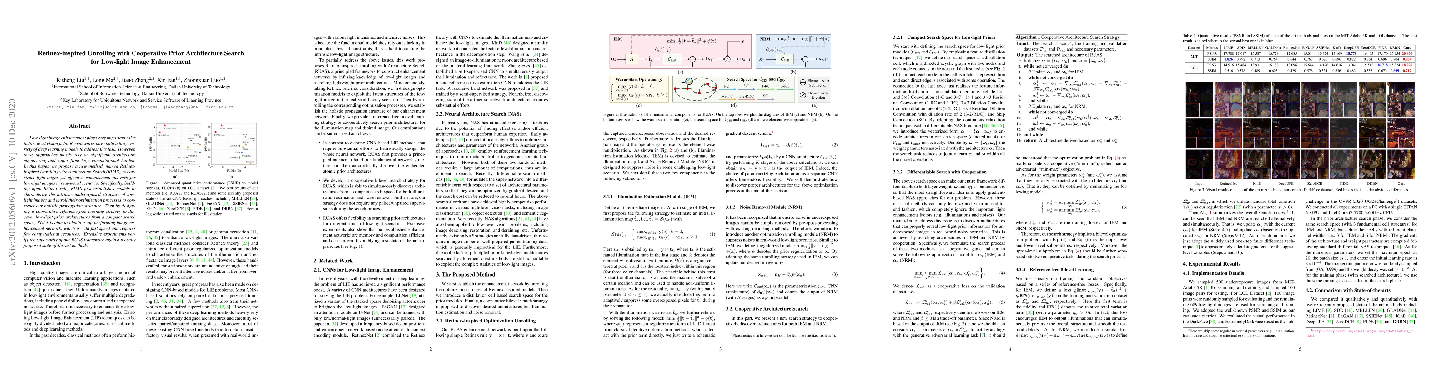 This paper introduces a lightweight enhancement network called Retinex-inspired Unrolling with Architecture Search (RUAS) for low-light image enhancement. RUAS leverages the Retinex theory to model intrinsic image structures and employs a cooperative prior architecture search to achieve high performance with minimal computational cost.