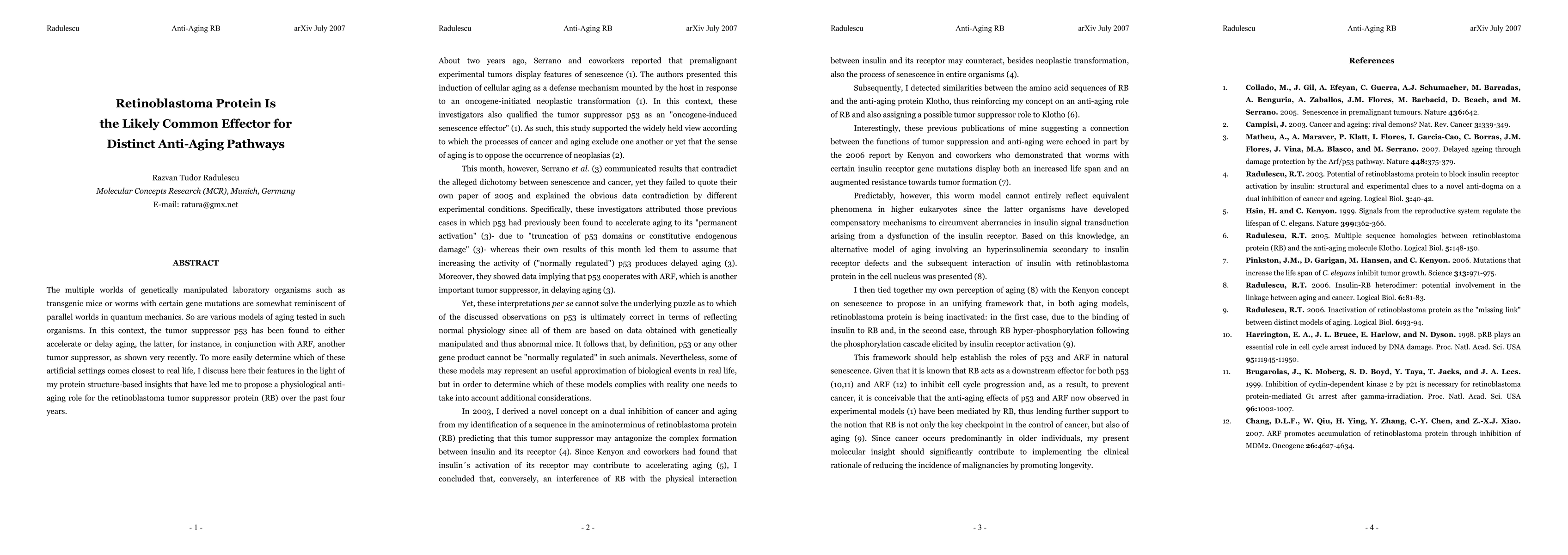 The multiple worlds of genetically manipulated laboratory organisms such as transgenic mice or worms with certain gene mutations are somewhat reminiscent of parallel worlds in quantum mechanics. So are various models of aging tested in such organisms. In this context, the tumor suppressor p53 has been found to either accelerate or delay aging, the latter, for instance, in conjunction with ARF, another tumor suppressor, as shown very recently. To more easily determine which of these artificial settings comes closest to real life, I discuss here their features in the light of my protein structure-based insights that have led me to propose a physiological anti-aging role for the retinoblastoma tumor suppressor protein (RB) over the past four years.