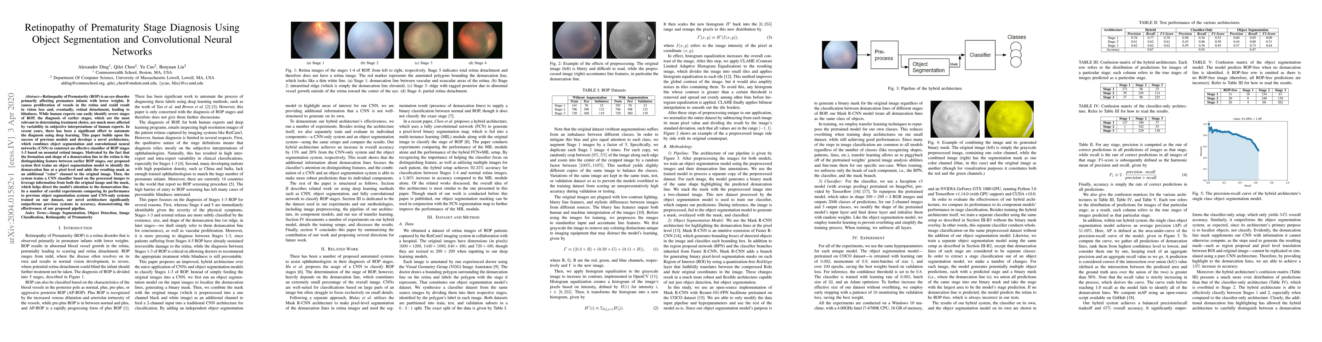 This paper proposes a novel architecture combining object segmentation and convolutional neural networks (CNN) to diagnose Retinopathy of Prematurity (ROP) stages 1-3 from neonatal retinal images. The system first identifies the demarcation line using segmentation, then trains a CNN classifier that leverages both the original image and the segmentation mask, significantly improving accuracy over previous models.