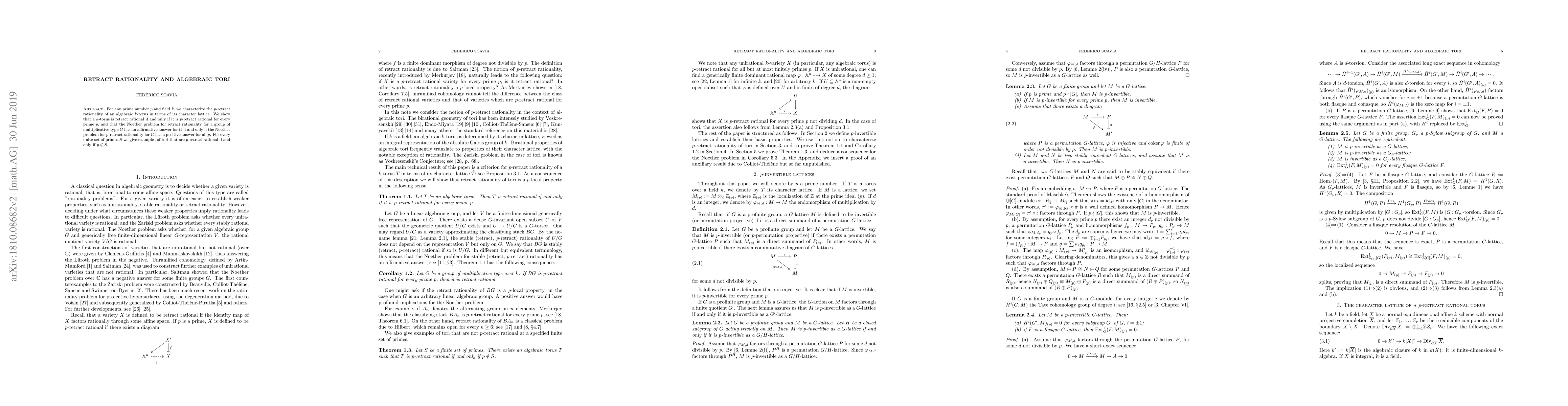This paper characterizes $p$-retract rationality of algebraic $k$-tori based on their character lattices, proving that a $k$-torus is retract rational if it is $p$-retract rational for all primes $p$. It also affirms the Noether problem for retract rationality if and only if it is true for $p$-retract rationality across all primes. Examples are provided for tori that are $p$-retract rational except for primes in a specified finite set.