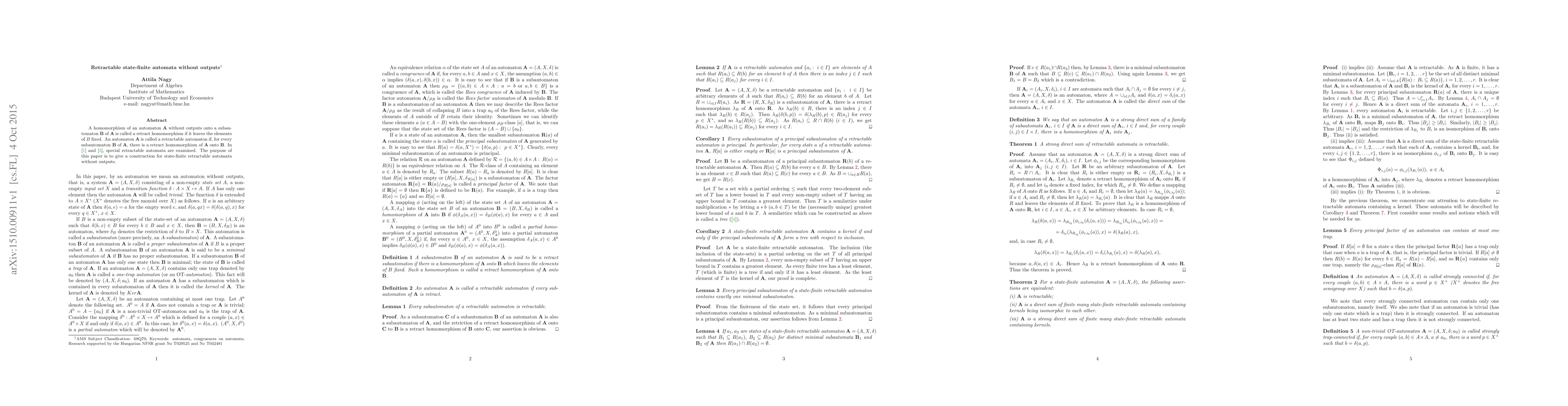 A homomorphism of an automaton ${\bf A}$ without outputs onto a subautomaton ${\bf B}$ of ${\bf A}$ is called a retract homomorphism if it leaves the elements of $B$ fixed. An automaton ${\bf A}$ is called a retractable automaton if, for every subautomaton ${\bf B}$ of ${\bf A}$, there is a retract homomorphism of ${\bf A}$ onto ${\bf B}$. In [1] and [3], special retractable automata are examined. The purpose of this paper is to give a complete description of state-finite retractable automata without outputs.