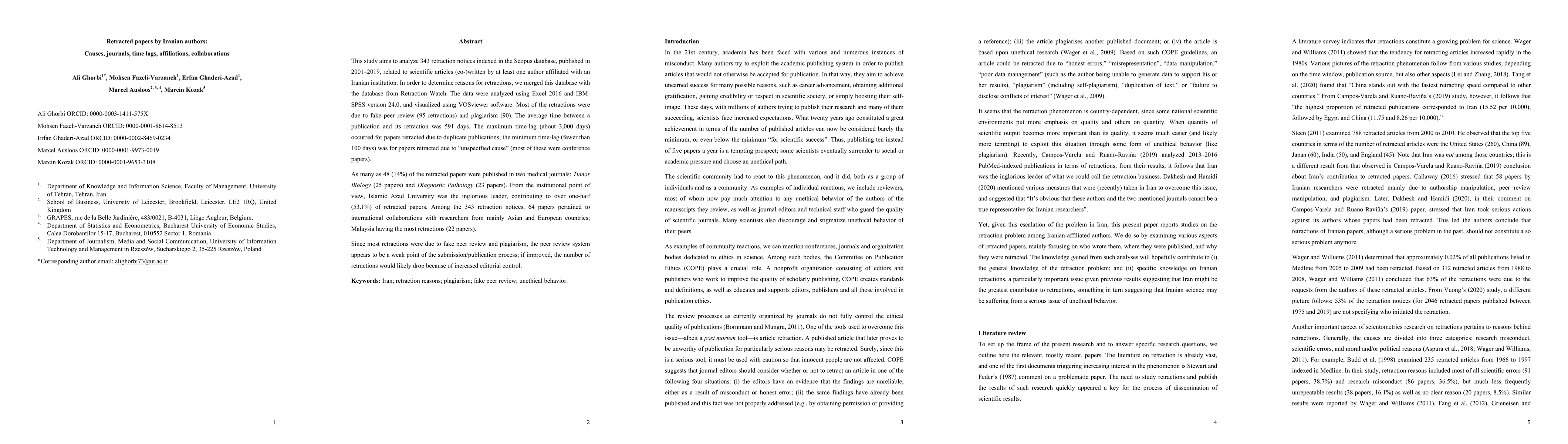 This study analyzes 343 retracted papers by Iranian authors from 2001-2019, finding that fake peer review and plagiarism were the main reasons for retractions. The average time to retraction was 591 days, with the longest lag for duplicate publications.