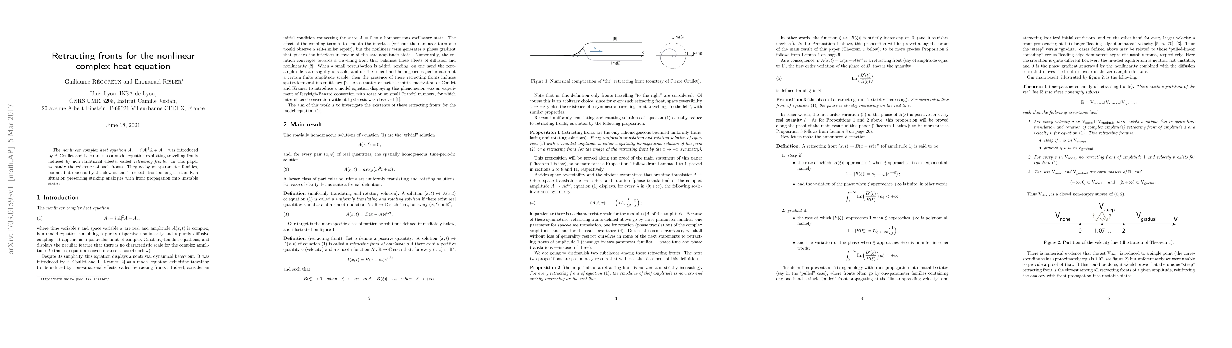 The "nonlinear complex heat equation" $A_t=i|A|^2A+A_{xx}$ was introduced by P. Coullet and L. Kramer as a model equation exhibiting travelling fronts induced by non-variational effects, called "retracting fronts". In this paper we study the existence of such fronts. They go by one-parameter families, bounded at one end by the slowest and "steepest" front among the family, a situation presenting striking analogies with front propagation into unstable states.