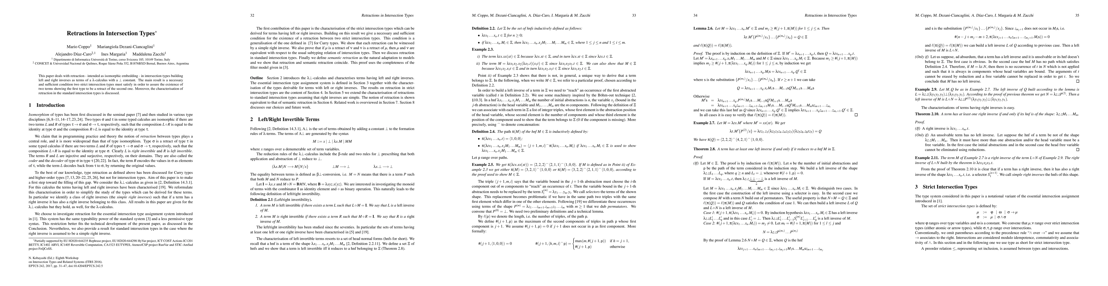 This paper investigates retractions in intersection types, establishing a necessary and sufficient condition for the existence of left and right inverses within a lambda calculus framework, including a bottom constant. It also characterizes retractions in standard intersection types.