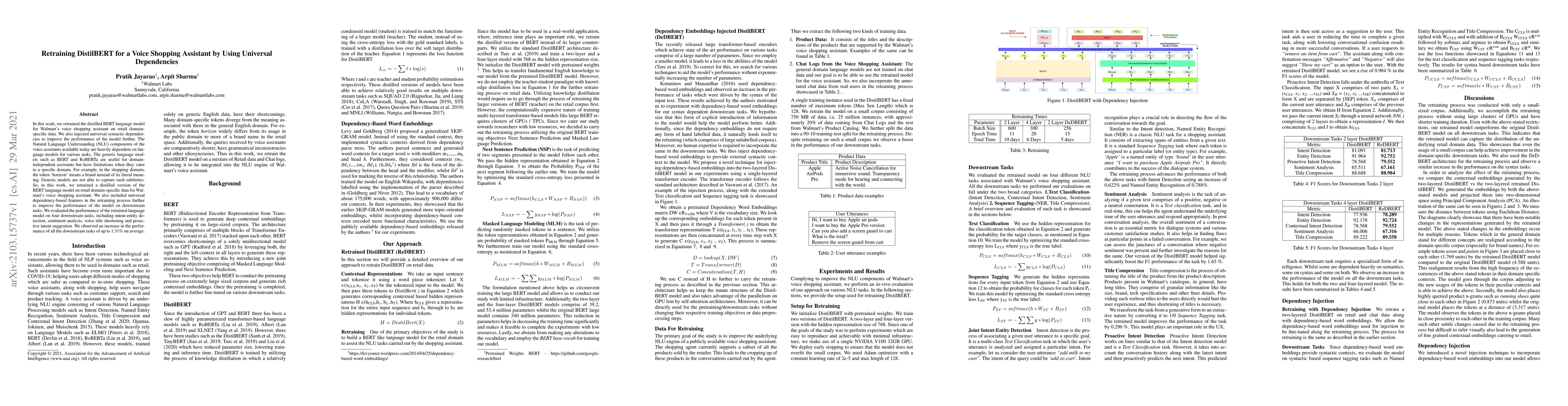 This paper retrains DistilBERT on Walmart's voice shopping assistant using retail domain-specific data and universal syntactic dependencies to enhance performance. The retrained model showed an average improvement of up to 1.31% across tasks like intent-entity detection and sentiment analysis.