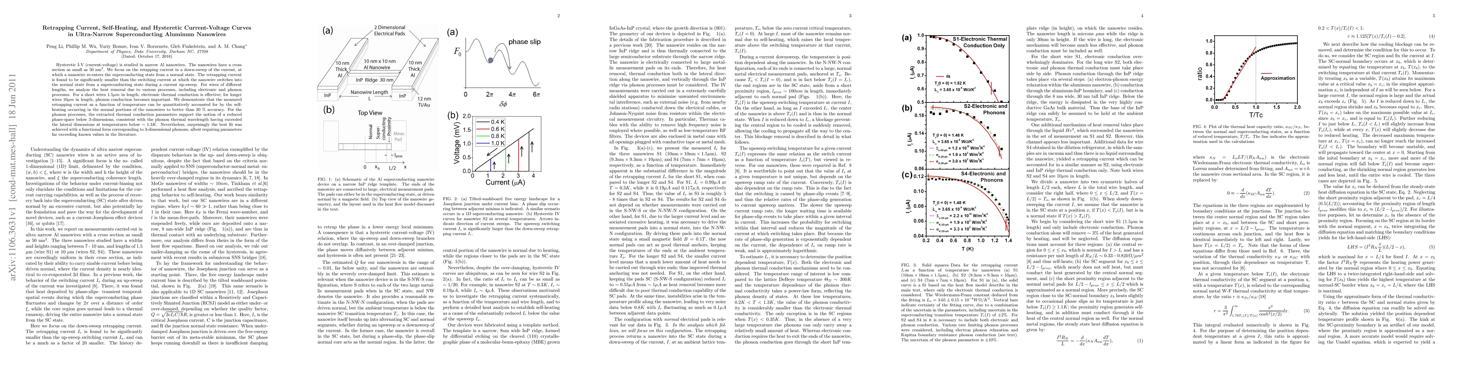 This paper investigates hysteretic current-voltage curves in ultra-narrow aluminum nanowires, focusing on the retrapping current during a down-sweep. The retrapping current is significantly smaller than the switching current during an up-sweep. The study analyzes heat removal mechanisms in wires of different lengths, finding electronic conduction effective in shorter wires and phonon conduction in longer ones. The retrapping current is quantitatively explained by self-heating in the normal portions of the nanowires.