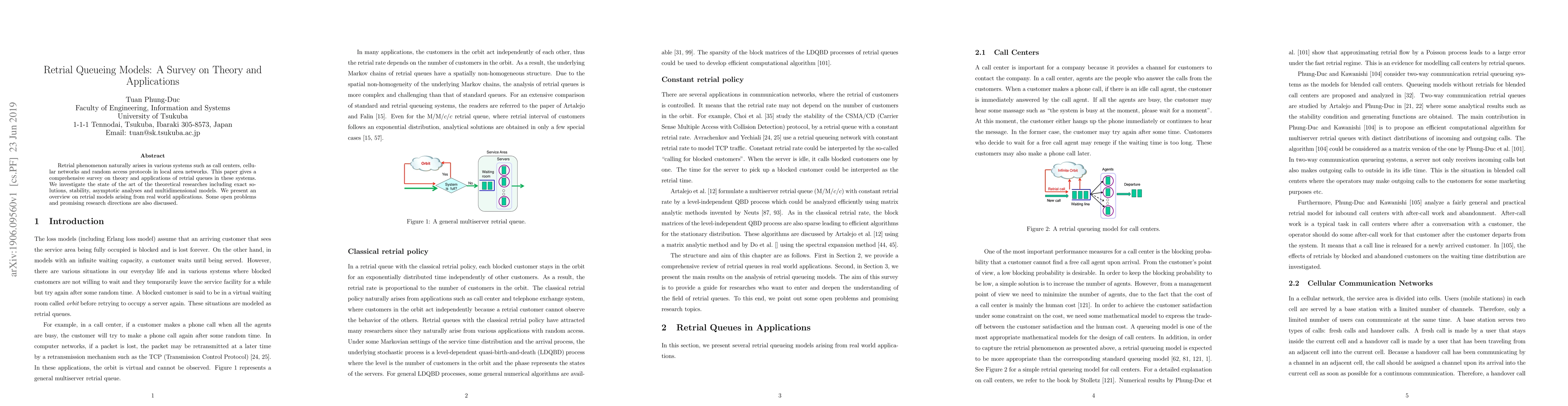 This paper provides a comprehensive survey on retrial queueing models in various systems like call centers and cellular networks. It covers theoretical research and real-world applications, discussing key findings, open problems, and promising research directions.