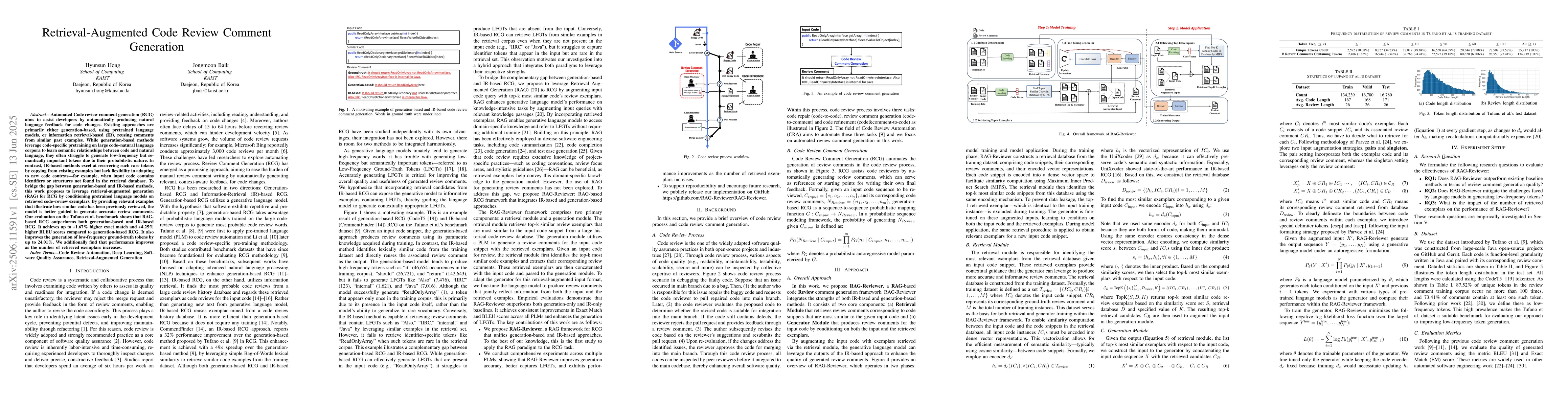 The research introduces Retrieval-Augmented Generation (RAG) for automated code review comment generation, combining strengths of generation-based and information retrieval-based methods. RAG uses pretrained language models conditioned on retrieved code-review exemplars, improving accuracy and generation of rare tokens, outperforming both generation-based and IR-based RCG by up to 1.67% exact match, 4.25% BLEU, and 24.01% for low-frequency tokens.
