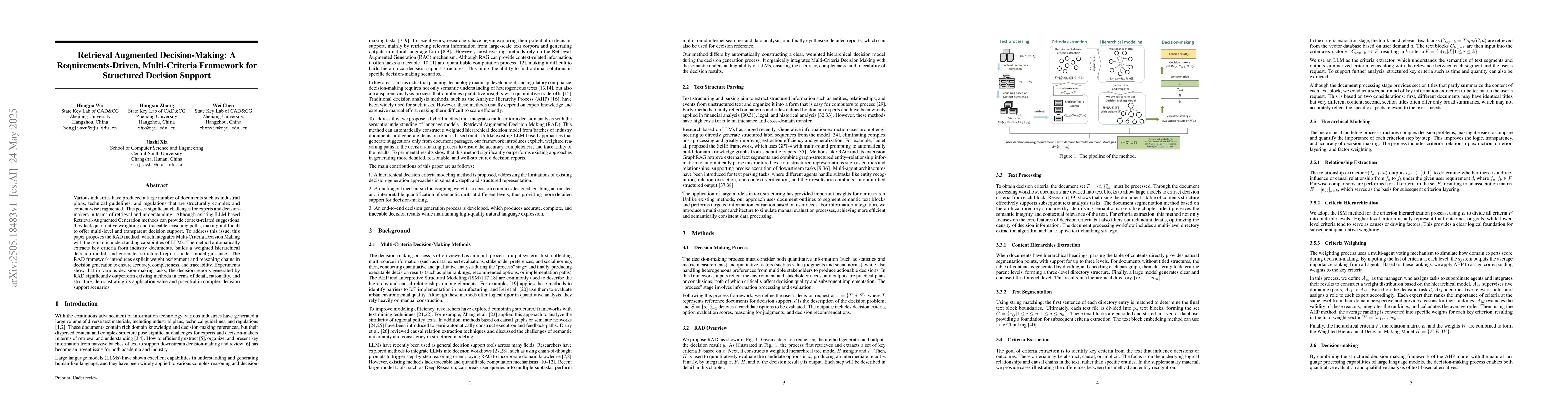 Various industries have produced a large number of documents such as industrial plans, technical guidelines, and regulations that are structurally complex and content-wise fragmented. This poses significant challenges for experts and decision-makers in terms of retrieval and understanding. Although existing LLM-based Retrieval-Augmented Generation methods can provide context-related suggestions, they lack quantitative weighting and traceable reasoning paths, making it difficult to offer multi-level and transparent decision support. To address this issue, this paper proposes the RAD method, which integrates Multi-Criteria Decision Making with the semantic understanding capabilities of LLMs. The method automatically extracts key criteria from industry documents, builds a weighted hierarchical decision model, and generates structured reports under model guidance. The RAD framework introduces explicit weight assignment and reasoning chains in decision generation to ensure accuracy, completeness, and traceability. Experiments show that in various decision-making tasks, the decision reports generated by RAD significantly outperform existing methods in terms of detail, rationality, and structure, demonstrating its application value and potential in complex decision support scenarios.