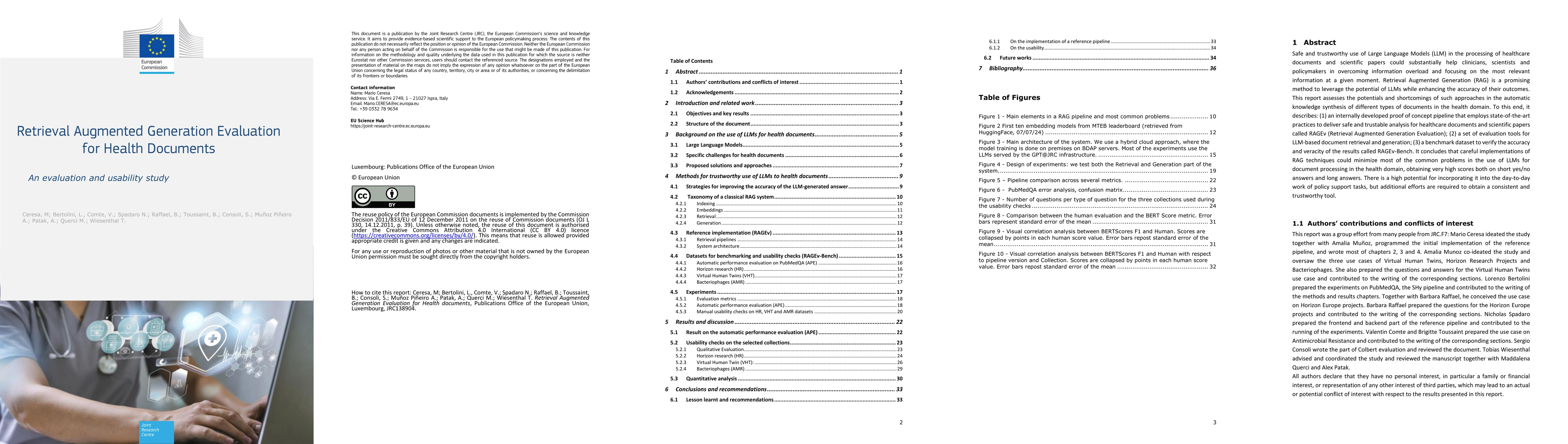 Safe and trustworthy use of Large Language Models (LLM) in the processing of healthcare documents and scientific papers could substantially help clinicians, scientists and policymakers in overcoming information overload and focusing on the most relevant information at a given moment. Retrieval Augmented Generation (RAG) is a promising method to leverage the potential of LLMs while enhancing the accuracy of their outcomes. This report assesses the potentials and shortcomings of such approaches in the automatic knowledge synthesis of different types of documents in the health domain. To this end, it describes: (1) an internally developed proof of concept pipeline that employs state-of-the-art practices to deliver safe and trustable analysis for healthcare documents and scientific papers called RAGEv (Retrieval Augmented Generation Evaluation); (2) a set of evaluation tools for LLM-based document retrieval and generation; (3) a benchmark dataset to verify the accuracy and veracity of the results called RAGEv-Bench. It concludes that careful implementations of RAG techniques could minimize most of the common problems in the use of LLMs for document processing in the health domain, obtaining very high scores both on short yes/no answers and long answers. There is a high potential for incorporating it into the day-to-day work of policy support tasks, but additional efforts are required to obtain a consistent and trustworthy tool.