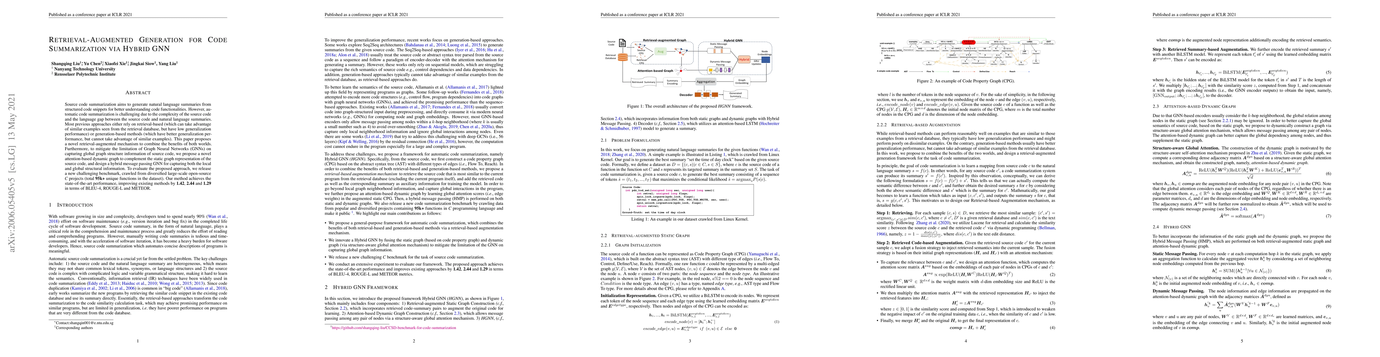 This paper proposes a retrieval-augmented generation method combining retrieval-based and generation-based techniques for code summarization, enhanced by a hybrid GNN that captures both local and global code structures. The approach achieves state-of-the-art performance on a new benchmark dataset from large-scale open-source C projects.