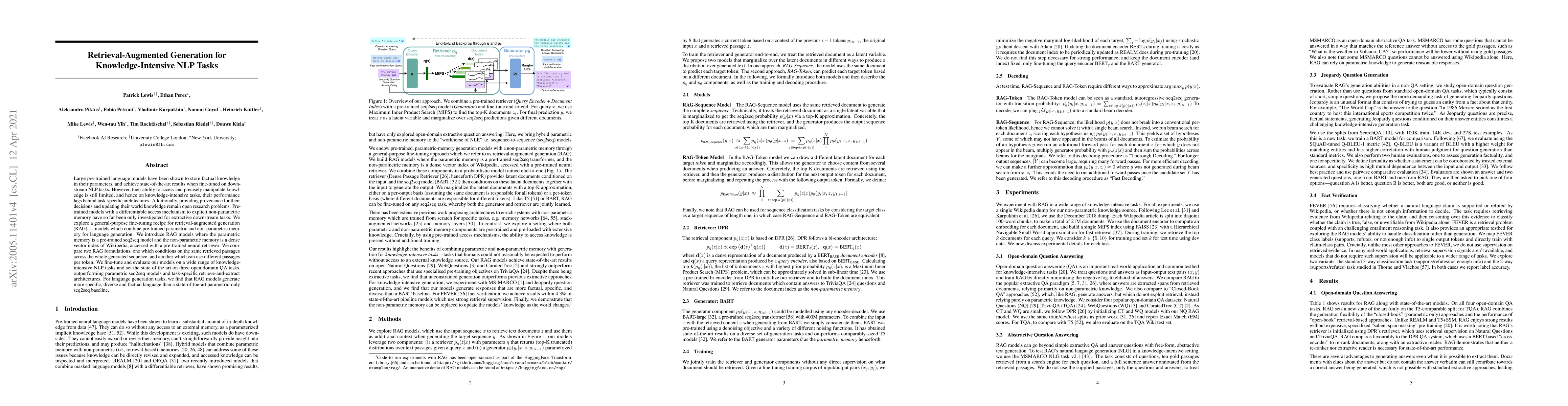 Large pre-trained language models have been shown to store factual knowledge in their parameters, and achieve state-of-the-art results when fine-tuned on downstream NLP tasks. However, their ability to access and precisely manipulate knowledge is still limited, and hence on knowledge-intensive tasks, their performance lags behind task-specific architectures. Additionally, providing provenance for their decisions and updating their world knowledge remain open research problems. Pre-trained models with a differentiable access mechanism to explicit non-parametric memory can overcome this issue, but have so far been only investigated for extractive downstream tasks. We explore a general-purpose fine-tuning recipe for retrieval-augmented generation (RAG) -- models which combine pre-trained parametric and non-parametric memory for language generation. We introduce RAG models where the parametric memory is a pre-trained seq2seq model and the non-parametric memory is a dense vector index of Wikipedia, accessed with a pre-trained neural retriever. We compare two RAG formulations, one which conditions on the same retrieved passages across the whole generated sequence, the other can use different passages per token. We fine-tune and evaluate our models on a wide range of knowledge-intensive NLP tasks and set the state-of-the-art on three open domain QA tasks, outperforming parametric seq2seq models and task-specific retrieve-and-extract architectures. For language generation tasks, we find that RAG models generate more specific, diverse and factual language than a state-of-the-art parametric-only seq2seq baseline.