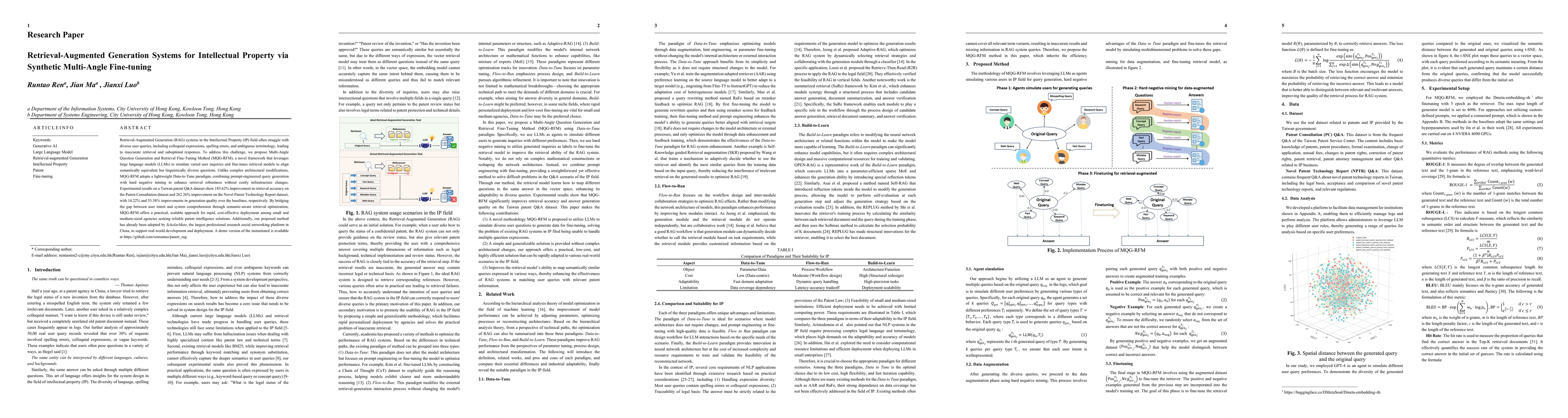 Retrieval-Augmented Generation (RAG) systems in the Intellectual Property (IP) field often struggle with diverse user queries, including colloquial expressions, spelling errors, and ambiguous terminology, leading to inaccurate retrieval and suboptimal responses. To address this challenge, we propose Multi-Angle Question Generation and Retrieval Fine-Tuning Method (MQG-RFM), a novel framework that leverages large language models (LLMs) to simulate varied user inquiries and fine-tunes retrieval models to align semantically equivalent but linguistically diverse questions. Unlike complex architectural modifications, MQG-RFM adopts a lightweight Data-to-Tune paradigm, combining prompt-engineered query generation with hard negative mining to enhance retrieval robustness without costly infrastructure changes. Experimental results on a Taiwan patent Q&A dataset show 185.62% improvement in retrieval accuracy on the Patent Consultation dataset and 262.26% improvement on the Novel Patent Technology Report dataset, with 14.22% and 53.58% improvements in generation quality over the baselines, respectively. By bridging the gap between user intent and system comprehension through semantic-aware retrieval optimization, MQG-RFM offers a practical, scalable approach for rapid, cost-effective deployment among small and medium-sized agencies seeking reliable patent intelligence solutions. Additionally, our proposed method has already been adopted by ScholarMate, the largest professional research social networking platform in China, to support real-world development and deployment. A demo version of the instantiated is available at https://github.com/renruntao/patent_rag.