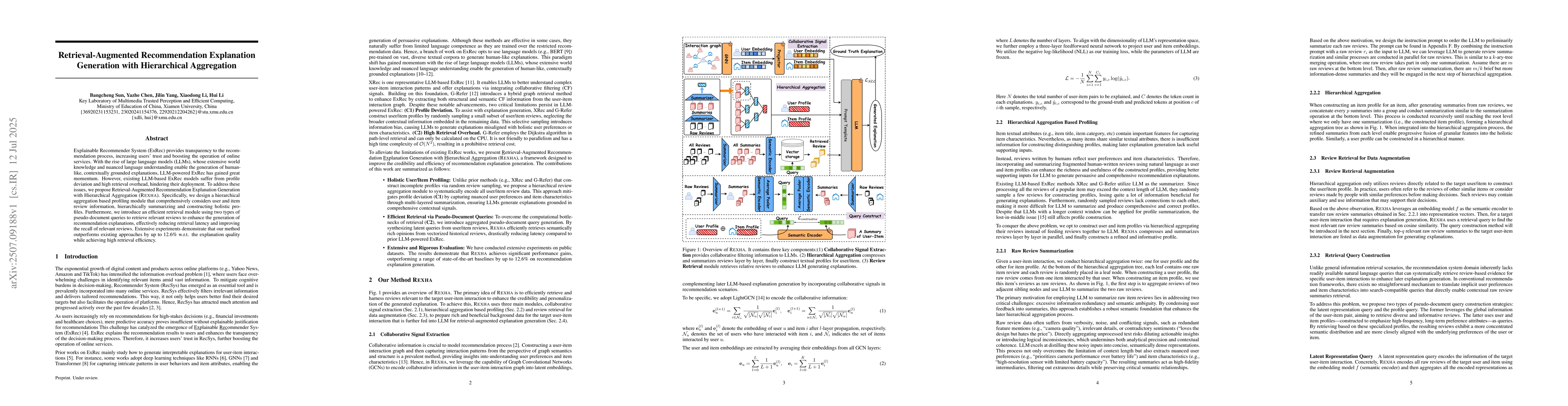 The paper introduces REXHA, a method to improve explainable recommender systems using hierarchical aggregation for profiling and efficient retrieval modules to reduce latency and enhance explanation quality. REXHA outperforms existing approaches by up to 12.6% in explanation quality while maintaining high retrieval efficiency.