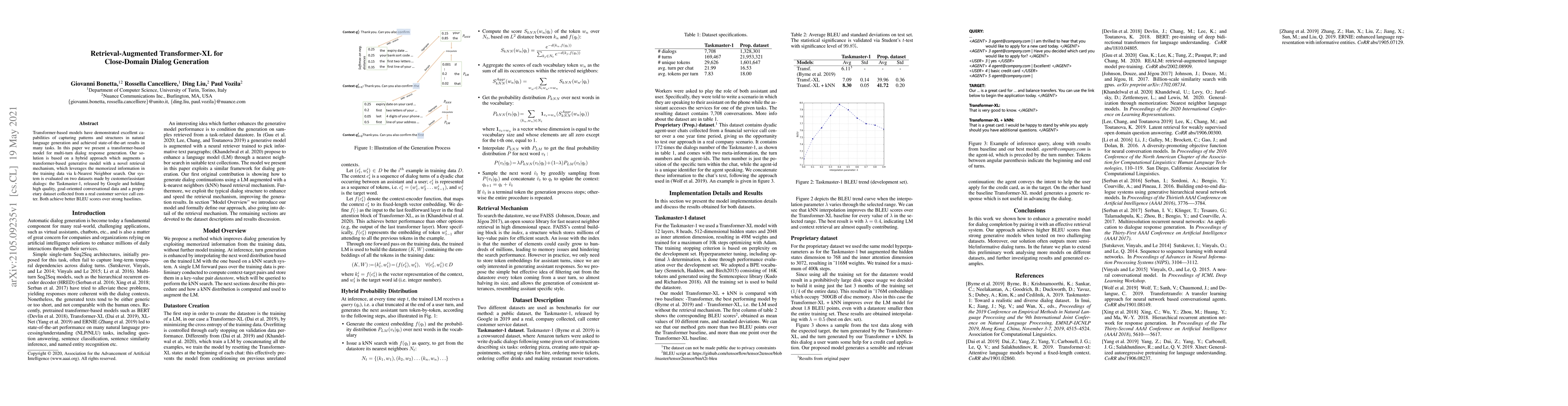 This paper introduces a hybrid model combining a Transformer-XL with a retrieval mechanism for multi-turn dialog generation, achieving superior BLEU scores on two customer/assistant dialog datasets compared to baselines. The retrieval mechanism enhances the model by leveraging k-Nearest Neighbor search on training data.