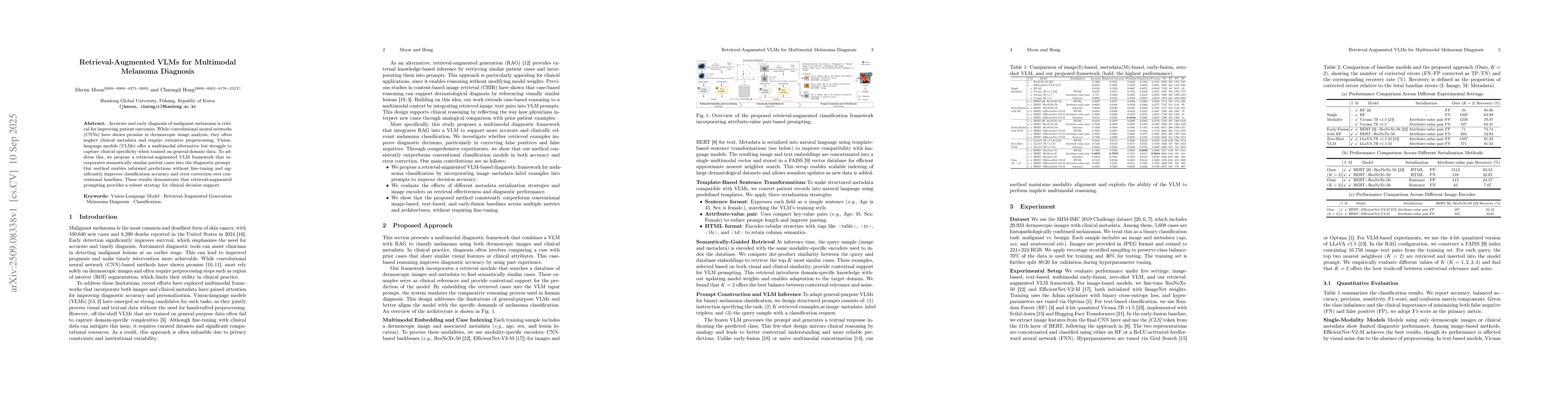 Accurate and early diagnosis of malignant melanoma is critical for improving patient outcomes. While convolutional neural networks (CNNs) have shown promise in dermoscopic image analysis, they often neglect clinical metadata and require extensive preprocessing. Vision-language models (VLMs) offer a multimodal alternative but struggle to capture clinical specificity when trained on general-domain data. To address this, we propose a retrieval-augmented VLM framework that incorporates semantically similar patient cases into the diagnostic prompt. Our method enables informed predictions without fine-tuning and significantly improves classification accuracy and error correction over conventional baselines. These results demonstrate that retrieval-augmented prompting provides a robust strategy for clinical decision support.