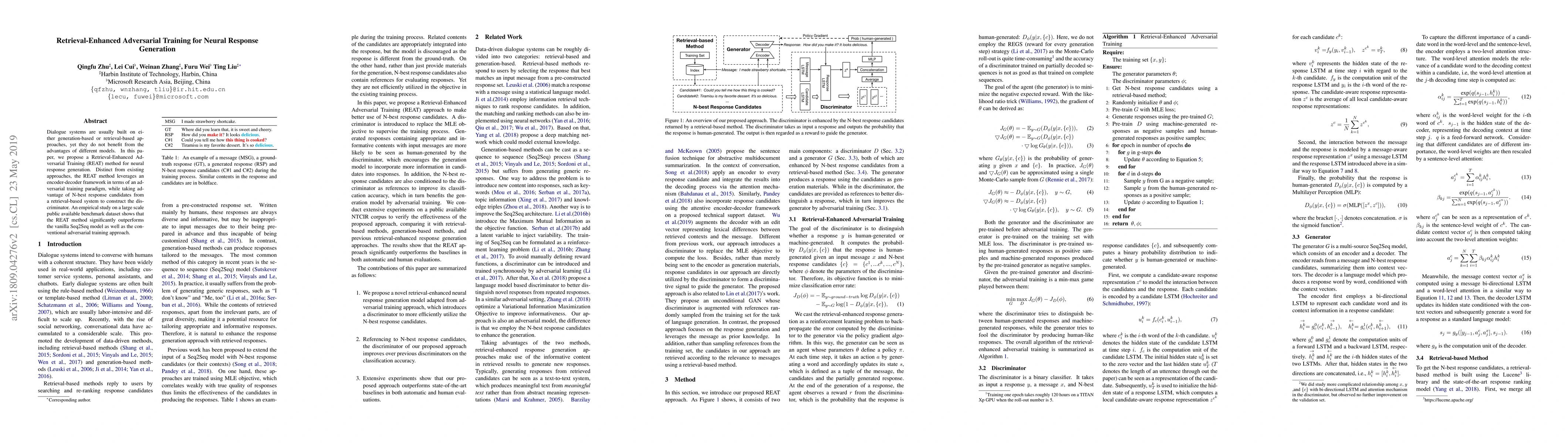 This paper introduces Retrieval-Enhanced Adversarial Training (REAT) for neural response generation, combining retrieval-based N-best candidates with adversarial training in an encoder-decoder framework. Empirical results demonstrate that REAT outperforms traditional Seq2Seq and adversarial training models on a benchmark dataset.