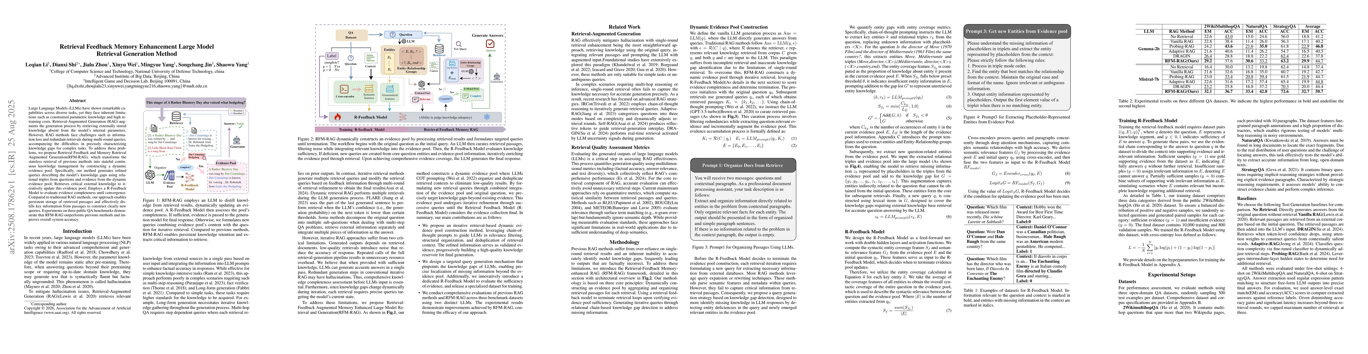 Large Language Models (LLMs) have shown remarkable capabilities across diverse tasks, yet they face inherent limitations such as constrained parametric knowledge and high retraining costs. Retrieval-Augmented Generation (RAG) augments the generation process by retrieving externally stored knowledge absent from the models internal parameters. However, RAG methods face challenges such as information loss and redundant retrievals during multi-round queries, accompanying the difficulties in precisely characterizing knowledge gaps for complex tasks. To address these problems, we propose Retrieval Feedback and Memory Retrieval Augmented Generation(RFM-RAG), which transforms the stateless retrieval of previous methods into stateful continuous knowledge management by constructing a dynamic evidence pool. Specifically, our method generates refined queries describing the models knowledge gaps using relational triples from questions and evidence from the dynamic evidence pool; Retrieves critical external knowledge to iteratively update this evidence pool; Employs a R-Feedback Model to evaluate evidence completeness until convergence. Compared to traditional RAG methods, our approach enables persistent storage of retrieved passages and effectively distills key information from passages to construct clearly new queries. Experiments on three public QA benchmarks demonstrate that RFM-RAG outperforms previous methods and improves overall system accuracy.