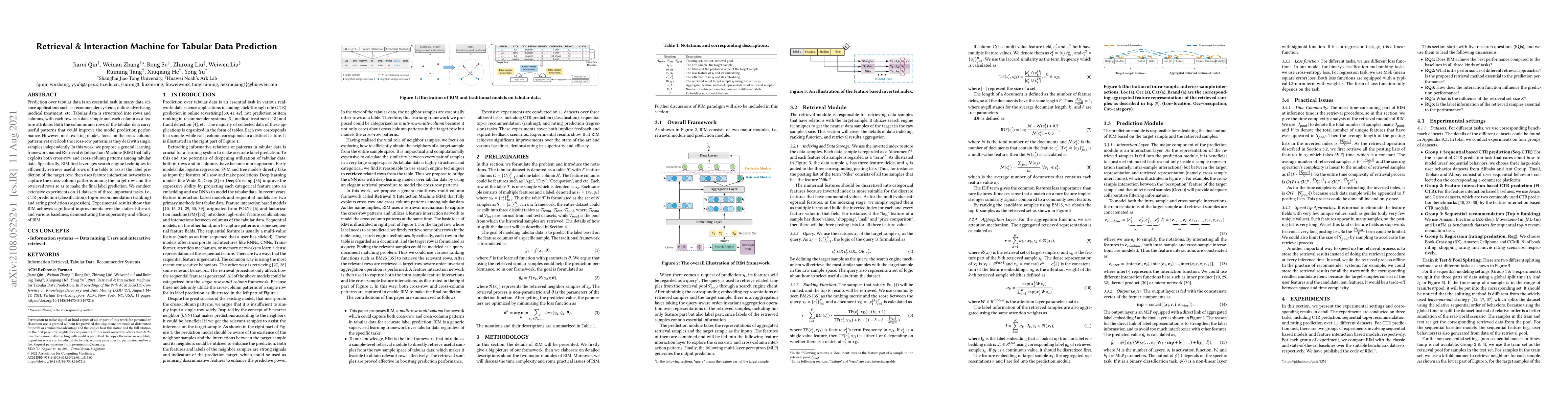 The Retrieval & Interaction Machine (RIM) framework leverages search techniques to retrieve relevant rows and interaction networks for capturing cross-column patterns, enhancing tabular data prediction performance across tasks like CTR prediction, recommendation, and rating prediction. RIM outperforms state-of-the-art methods, showcasing its effectiveness.