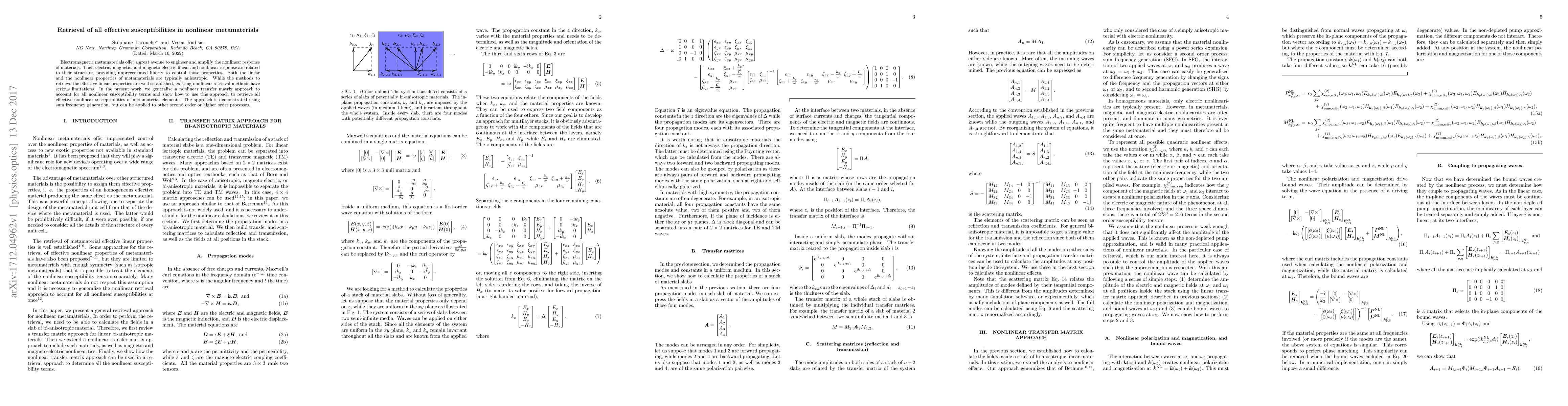 Electromagnetic metamaterials offer a great avenue to engineer and amplify the nonlinear response of materials. Their electric, magnetic, and magneto-electric linear and nonlinear response are related to their structure, providing unprecedented liberty to control those properties. Both the linear and the nonlinear properties of metamaterials are typically anisotropic. While the methods to retrieve the effective linear properties are well established, existing nonlinear retrieval methods have serious limitations. In the present work, we generalize a nonlinear transfer matrix approach to account for all nonlinear susceptibility terms and show how to use this approach to retrieve all effective nonlinear susceptibilities of metamaterial elements. The approach is demonstrated using sum frequency generation, but can be applied to other second order or higher order processes.