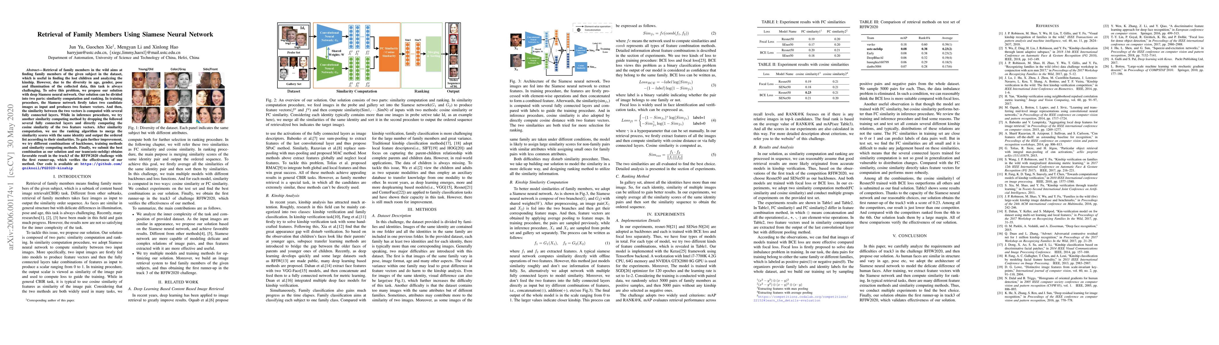 A Siamese neural network is proposed to retrieve family members from a dataset, achieving favorable results in a competition, with the ability to handle diverse data challenges such as age, gender, pose, and illumination.