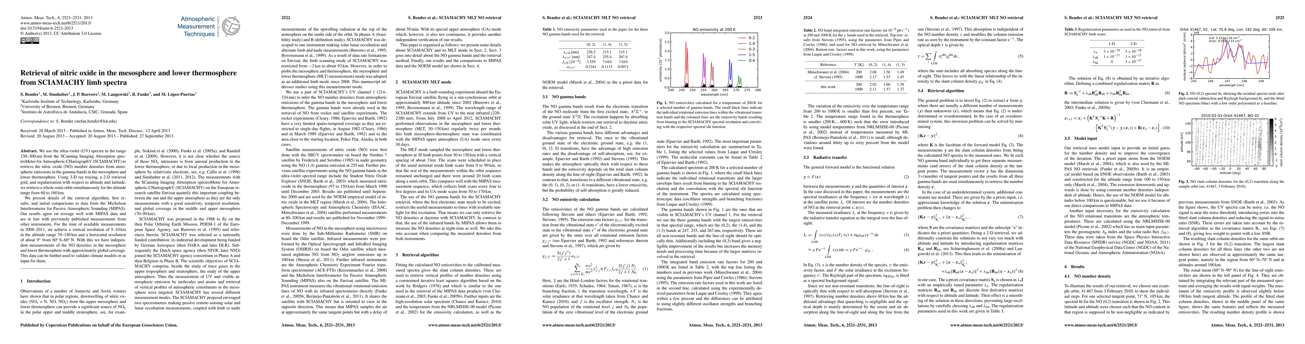 This paper retrieves nitric oxide (NO) number densities in the mesosphere and lower thermosphere using SCIAMACHY UV spectra. The study achieves a vertical resolution of 5-10 km and a horizontal resolution of about 9°, providing independent measurements that compare well with MIPAS data and previous measurements.