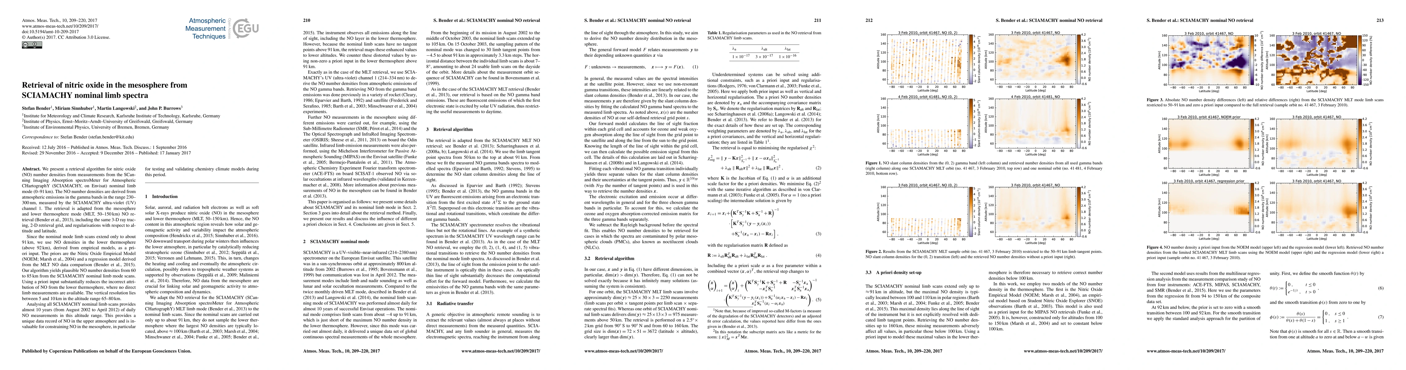 This paper presents a retrieval algorithm for nitric oxide (NO) number densities from SCIAMACHY nominal limb mode measurements, extending retrievals to the mesosphere (60-85 km). The algorithm uses empirical models for NO densities above 92 km, yielding a vertical resolution of 5-10 km and providing nearly 10 years of daily NO data for climate model validation.