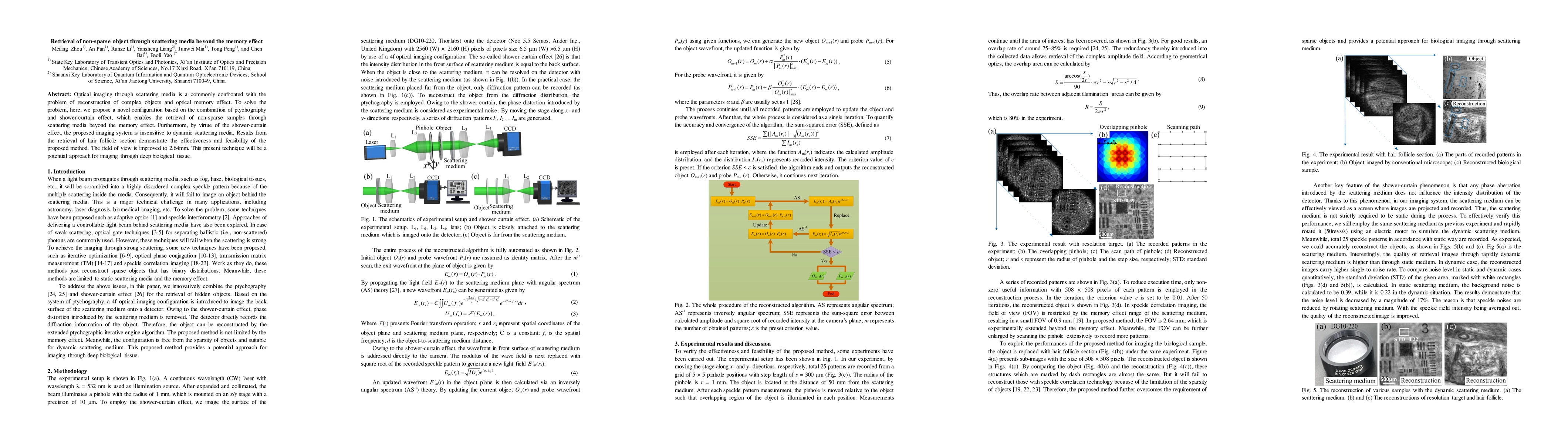 This paper proposes a novel method combining ptychography and the shower-curtain effect to retrieve non-sparse objects through scattering media beyond the memory effect, demonstrating improved imaging of deep biological tissues with a 2.64mm field of view. The technique is also shown to be robust against dynamic scattering variations.
