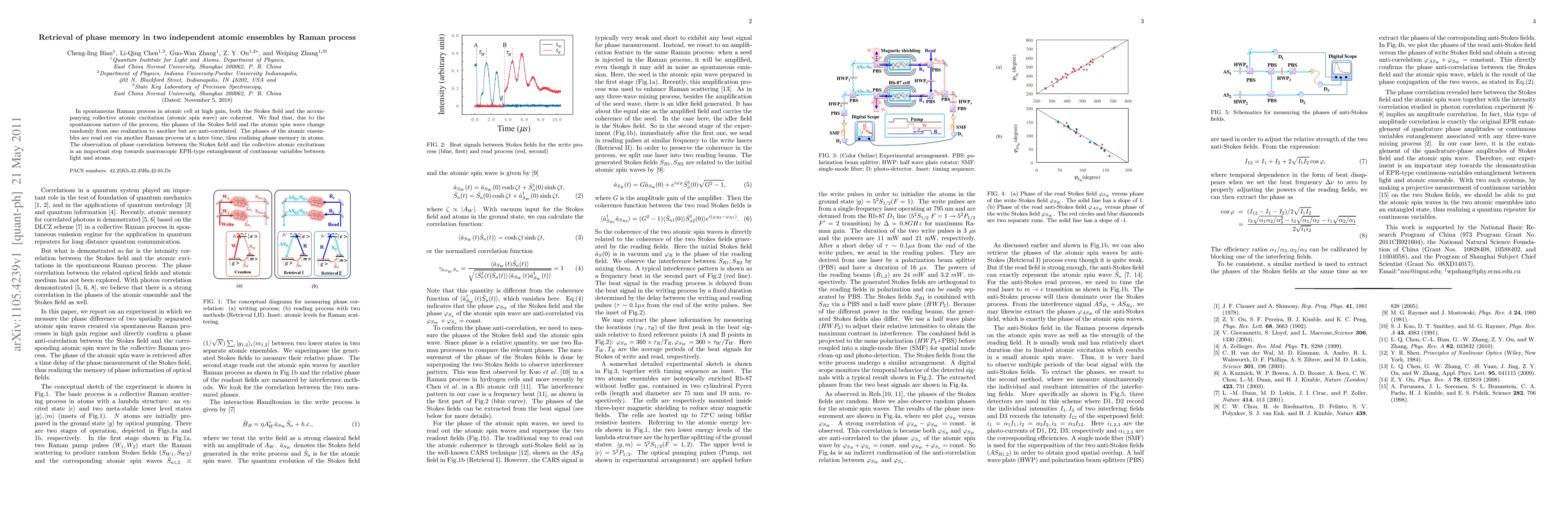 This paper demonstrates the retrieval of phase memory in two independent atomic ensembles via a Raman process, showing that the phases of the Stokes field and atomic spin waves are anti-correlated despite random changes. This phase correlation is crucial for achieving macroscopic EPR-type entanglement between light and atomic ensembles.
