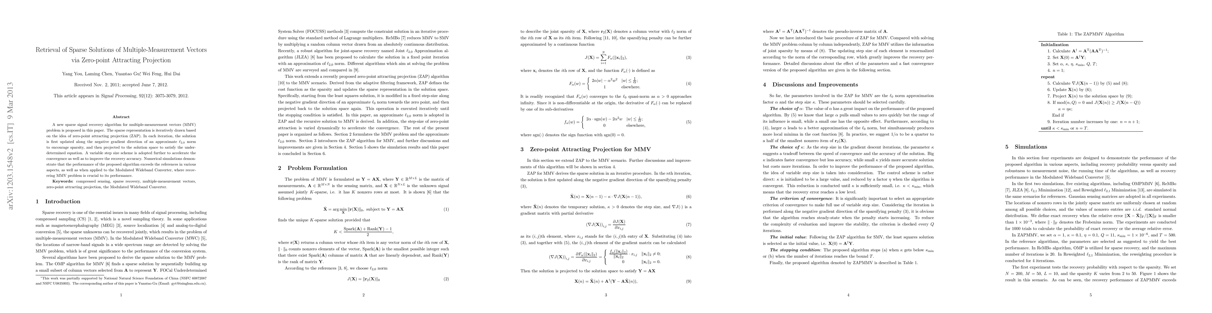 This paper introduces a novel sparse signal recovery algorithm for the multiple-measurement vectors (MMV) problem using zero-point attracting projection (ZAP). The algorithm iteratively updates the solution along the negative gradient direction of an approximate $\ell_{2,0}$ norm to enhance sparsity, followed by projection to satisfy the under-determined equation, with a variable step size to boost convergence and accuracy.