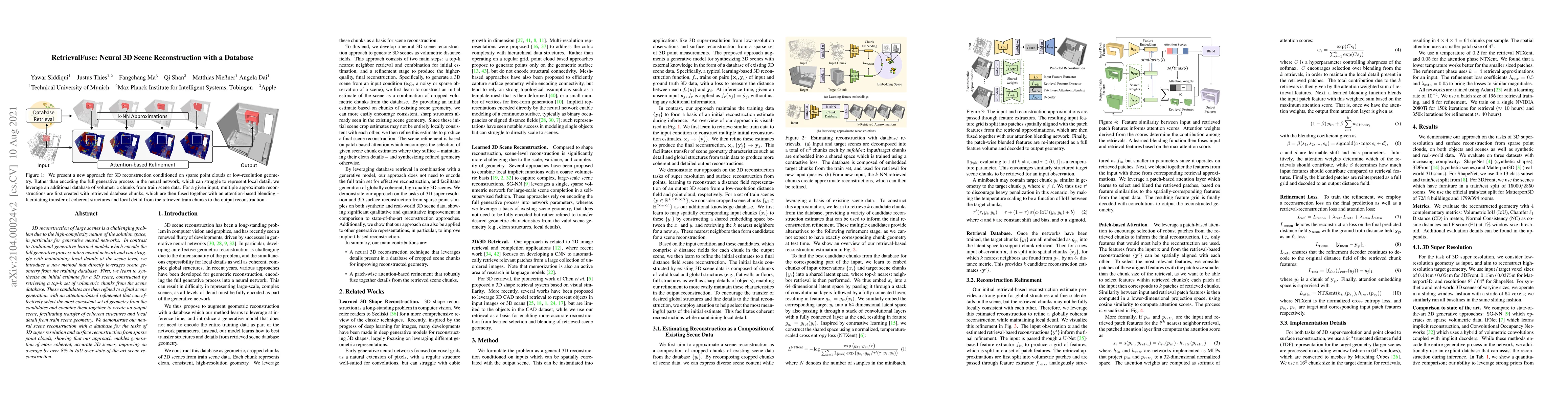 RetrievalFuse introduces a neural method for 3D scene reconstruction by leveraging a database of volumetric chunks, synthesizing initial estimates, and refining them with attention-based techniques to generate coherent, detailed 3D scenes, outperforming state-of-the-art methods by over 8% in Intersection over Union (IoU).