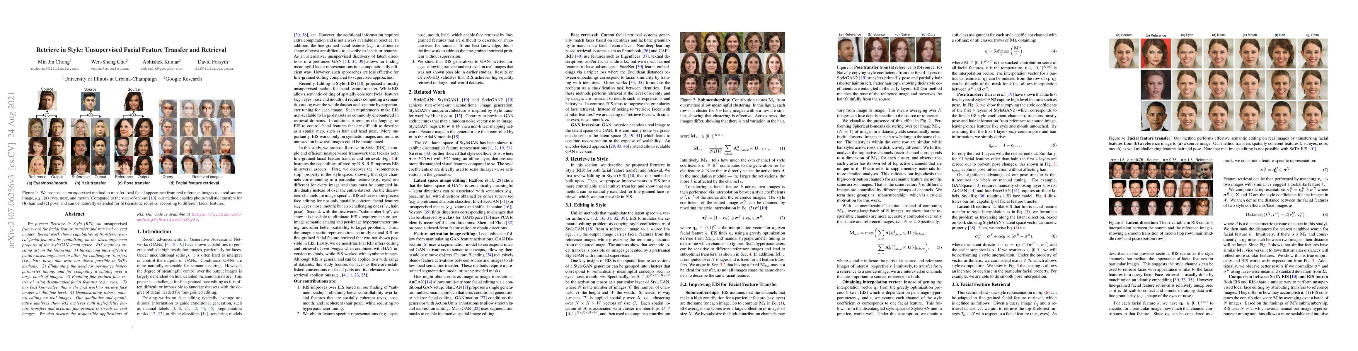 We present Retrieve in Style (RIS), an unsupervised framework for facial feature transfer and retrieval on real images. Recent work shows capabilities of transferring local facial features by capitalizing on the disentanglement property of the StyleGAN latent space. RIS improves existing art on the following: 1) Introducing more effective feature disentanglement to allow for challenging transfers (ie, hair, pose) that were not shown possible in SoTA methods. 2) Eliminating the need for per-image hyperparameter tuning, and for computing a catalog over a large batch of images. 3) Enabling fine-grained face retrieval using disentangled facial features (eg, eyes). To our best knowledge, this is the first work to retrieve face images at this fine level. 4) Demonstrating robust, natural editing on real images. Our qualitative and quantitative analyses show RIS achieves both high-fidelity feature transfers and accurate fine-grained retrievals on real images. We also discuss the responsible applications of RIS.