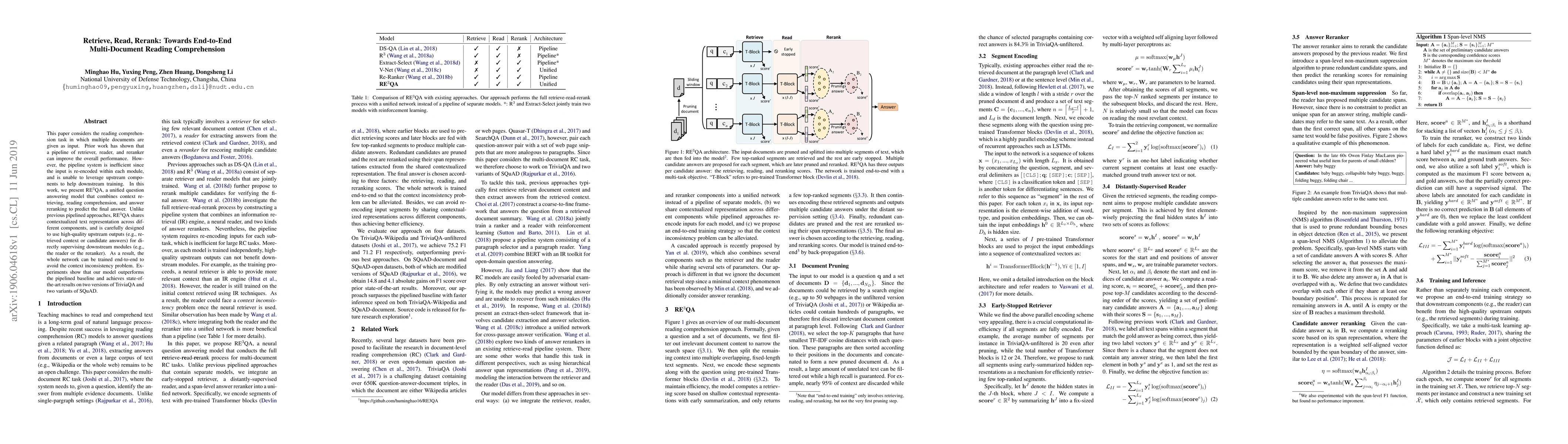 This paper considers the reading comprehension task in which multiple documents are given as input. Prior work has shown that a pipeline of retriever, reader, and reranker can improve the overall performance. However, the pipeline system is inefficient since the input is re-encoded within each module, and is unable to leverage upstream components to help downstream training. In this work, we present RE$^3$QA, a unified question answering model that combines context retrieving, reading comprehension, and answer reranking to predict the final answer. Unlike previous pipelined approaches, RE$^3$QA shares contextualized text representation across different components, and is carefully designed to use high-quality upstream outputs (e.g., retrieved context or candidate answers) for directly supervising downstream modules (e.g., the reader or the reranker). As a result, the whole network can be trained end-to-end to avoid the context inconsistency problem. Experiments show that our model outperforms the pipelined baseline and achieves state-of-the-art results on two versions of TriviaQA and two variants of SQuAD.