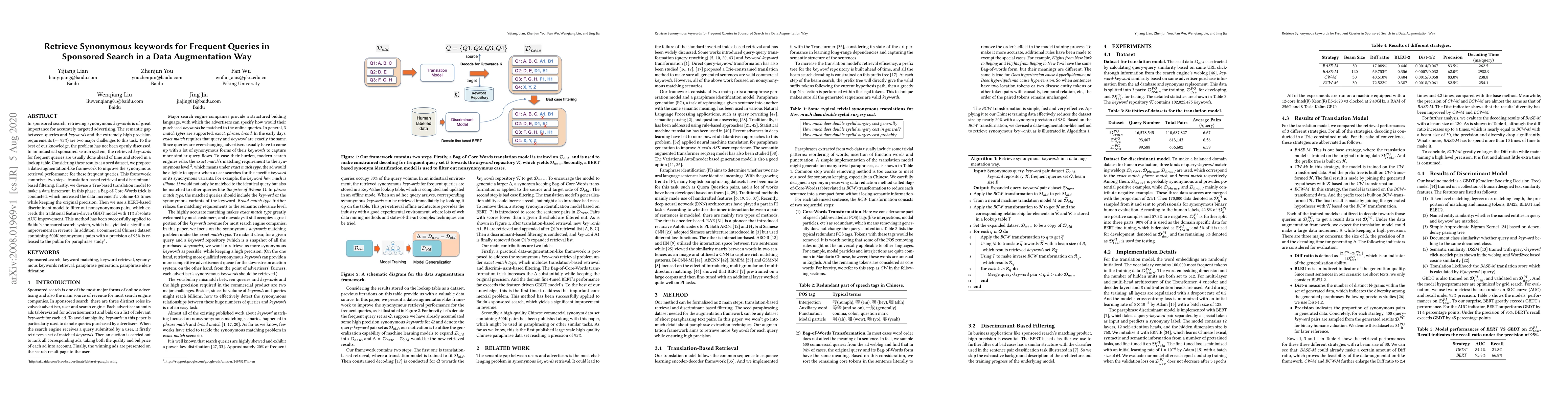 This paper proposes a data-augmentation-like framework to improve the retrieval of synonymous keywords for frequent queries in sponsored search, addressing the semantic gap and high precision requirements. The method uses a Trie-based translation model and a BERT-based discriminant model to enhance performance, achieving a 11% AUC improvement over traditional models and significant revenue growth in Baidu's system.