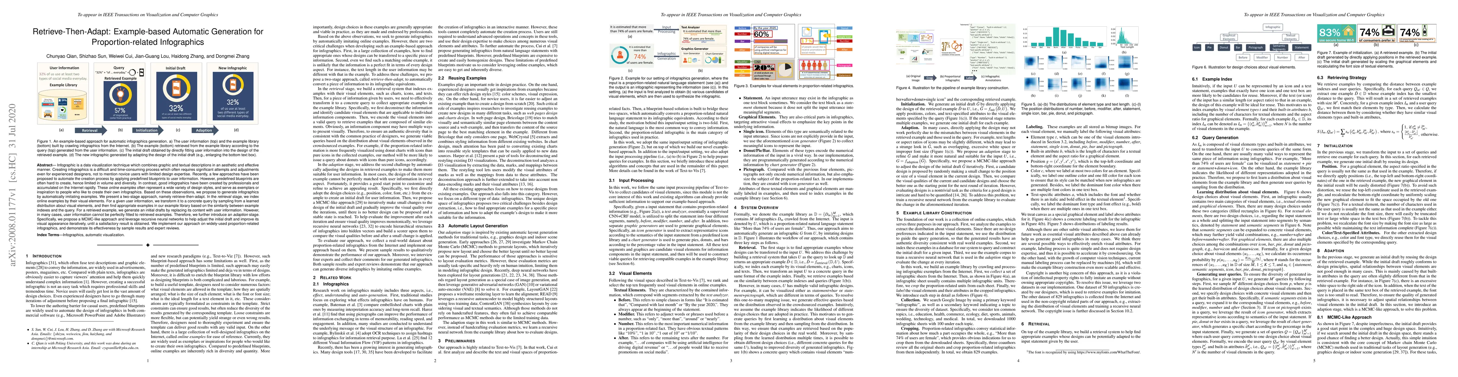 This paper proposes a "retrieve-then-adapt" method for automatically generating proportion-related infographics by imitating online examples. It involves retrieving suitable examples based on visual elements and adapting them to fit user-provided information using a recursive neural network and MCMC-like iterative adjustment.