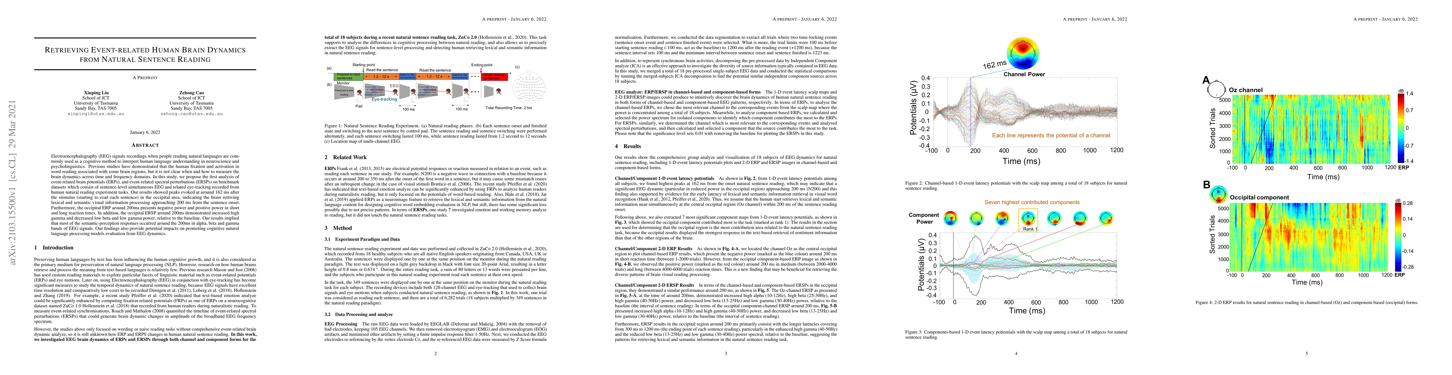 This study analyzes EEG and eye-tracking data from natural sentence reading to retrieve event-related brain dynamics. It reveals peaks around 162 ms in the occipital area, indicating lexical and semantic visual processing around 200 ms post-sentence onset, with significant changes in gamma, beta, and alpha bands.