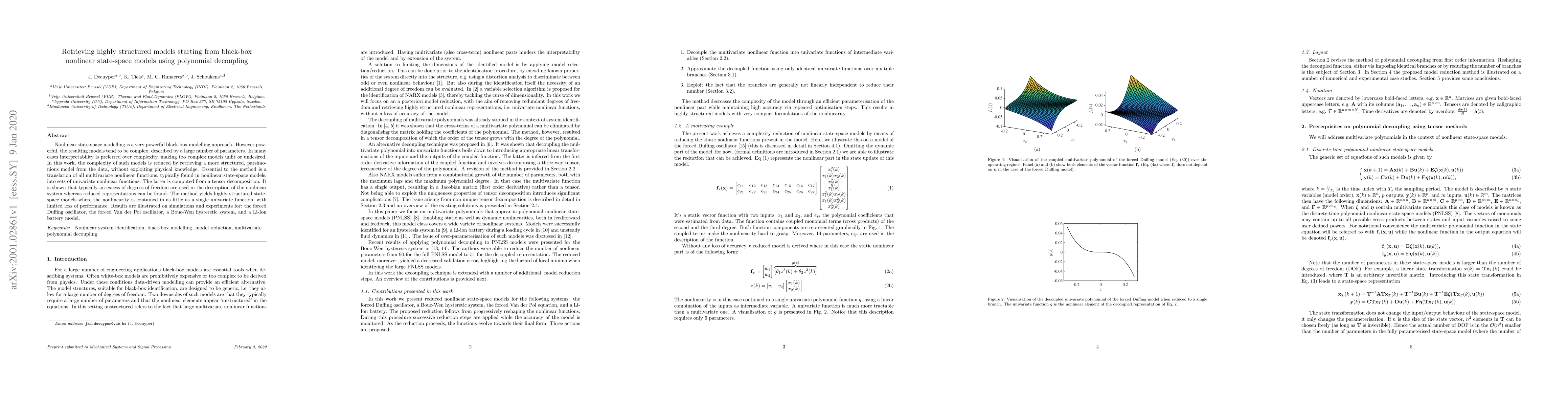 This paper proposes a method to simplify complex black-box nonlinear state-space models by decoupling multivariate nonlinear functions into univariate ones through tensor decomposition, yielding more interpretable and structured models with minimal performance loss. The approach is demonstrated on various systems including oscillators and battery models.