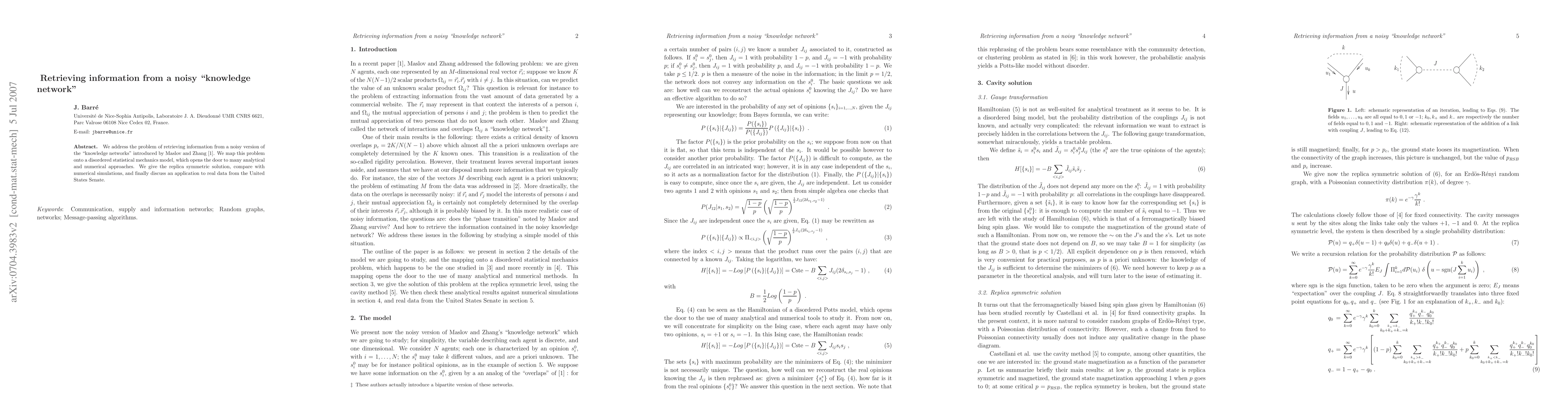 The paper addresses information retrieval from a noisy 'knowledge network', mapping the problem to a disordered statistical mechanics model. It provides a replica symmetric solution, compares it with numerical simulations, and discusses an application to real data from the United States Senate.