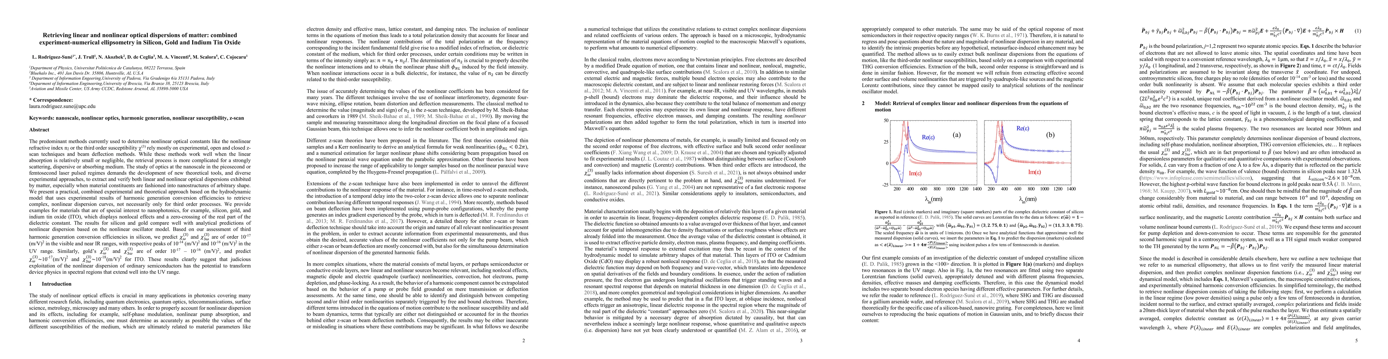 The predominant methods currently used to determine nonlinear optical constants like the nonlinear refractive index n2 or chi3 rely mostly on experimental, open and closed z-scan techniques and beam deflection methods. While these methods work well when the linear absorption is relatively small or negligible, the retrieval process is more complicated for a strongly scattering, dispersive or absorbing medium. The study of optics at the nanoscale in the ps or fs regimes demands the development of new theoretical tools experimental approaches, to extract and verify both linear and nonlinear optical dispersions exhibited by matter, especially when material constituents are fashioned into nanostructures of arbitrary shape. We present a practical, combined experimental and theoretical approach based on a hydrodynamic model that uses experimental results of harmonic generation conversion efficiencies to retrieve complex, nonlinear dispersion curves, not necessarily only for third order processes. We provide examples for materials that are of special interest to nanophotonics, silicon, gold, and indium tin oxide, which displays nonlocal effects and a zero-crossing of the real part of the dielectric constant. The results for silicon and gold compare well with analytical predictions based on the nonlinear oscillator model. Based on our assessment of THG conversion efficiencies in silicon, we predict chi3(w) and chi3(3w) are of order 10^(-17)(m/V)^2, in the visible and IR ranges, with respective peaks of 10^(-14) and 10^(-16)(m/V)^2 in the UV range. Similarly, gold's chi3(w) and chi3(3w) are of order 10^(-17) and 10^(-16)(m/V)^2, and predict chi3(w)~10^(-17)(m/V)^2 and chi3(3w)~10^(-18)(m/V)^2 for ITO. These results suggest that judicious exploitation of the nonlinear dispersion of ordinary semiconductors can transform device physics in spectral regions that extend well into the UV range.