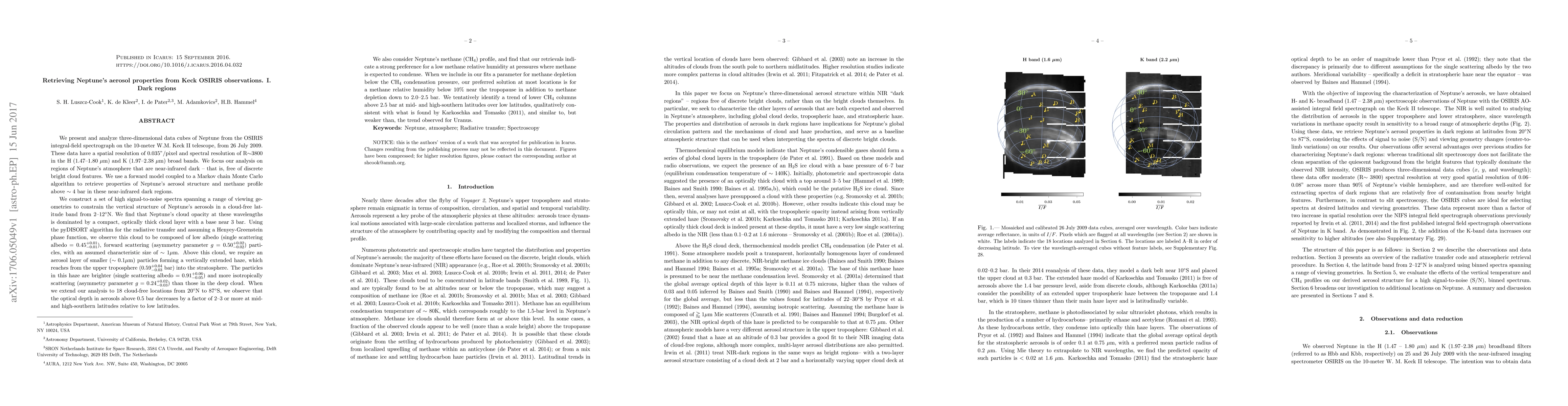 This study analyzes Keck OSIRIS observations of Neptune's dark regions to retrieve aerosol properties and methane profiles. The analysis reveals a compact, optically thick cloud layer near 3 bar composed of low albedo particles, topped by a vertically extended haze of smaller particles reaching into the stratosphere. Methane relative humidity is found to be low, with depletion extending down to 2.5 bar.