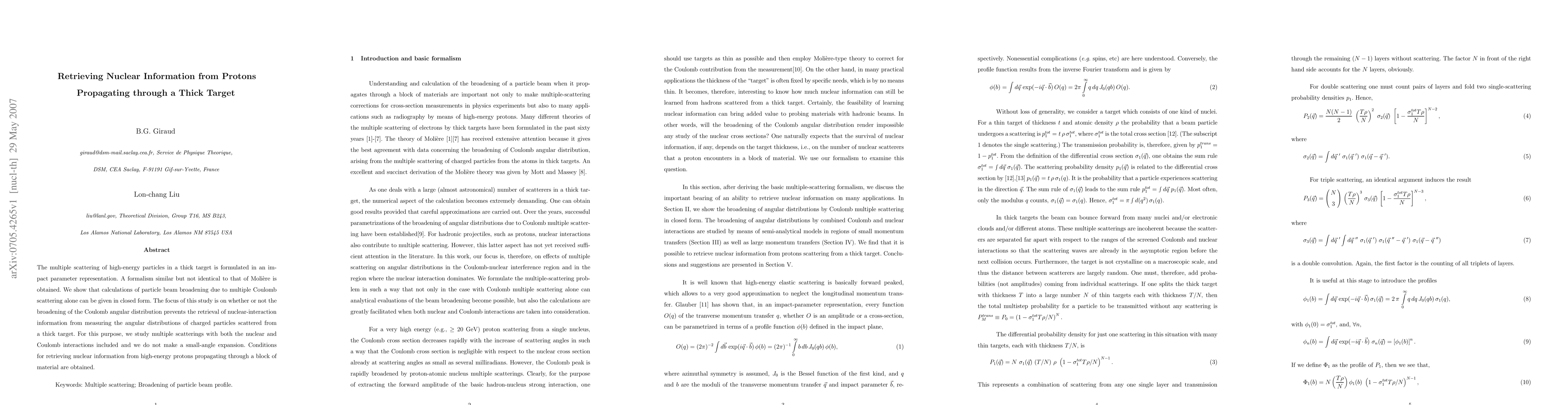 The multiple scattering of high-energy particles in a thick target is fromulated in an impact parameter representation. A formalism similar but not identical to that of Moliere is obtained. We show that calculations of particle beam broadening due to multiple Coulomb scattering alone can be given in closed form. The focus of this study is on whether or not the broadening of the Coulomb angular distribution prevents the retrieval of nuclear-interaction information from mesauring the angular distributions of charged partiles scattered from a thick target. For this purpose, we study multiple scatterings with both the nuclear and Coulomb interactions included and we do not make a small-angle expansion. Condition for retrieving nuclear infomration from high-energy protons propagating through a block of material are obtained.
