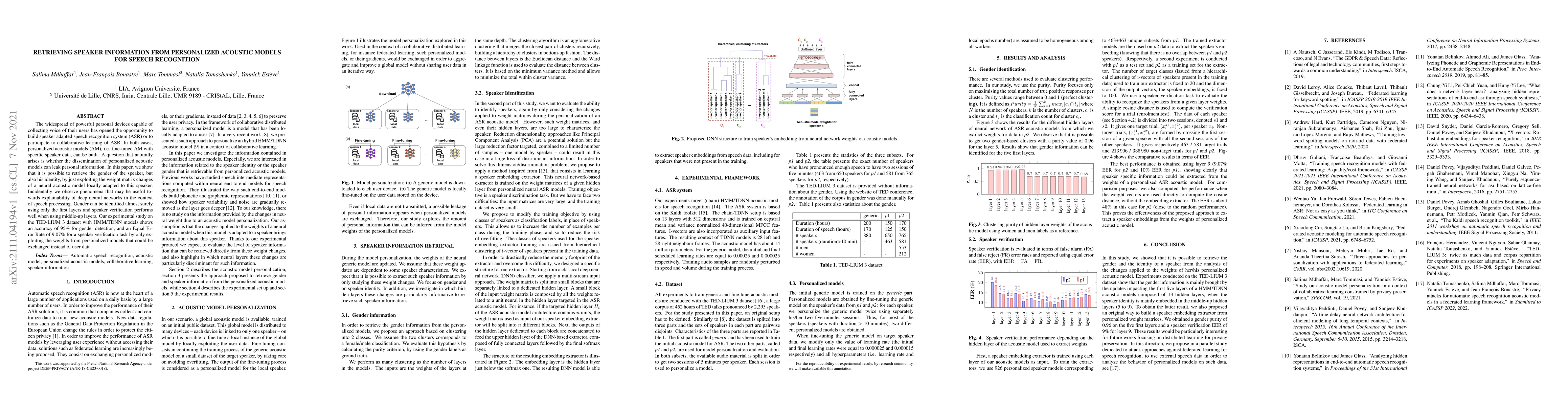 This paper investigates the potential for retrieving speaker identity and gender from personalized acoustic models used in speech recognition systems. Experimental results show high accuracy in gender detection and speaker verification using only the weight matrices of these models, raising privacy concerns about the dissemination of such models.