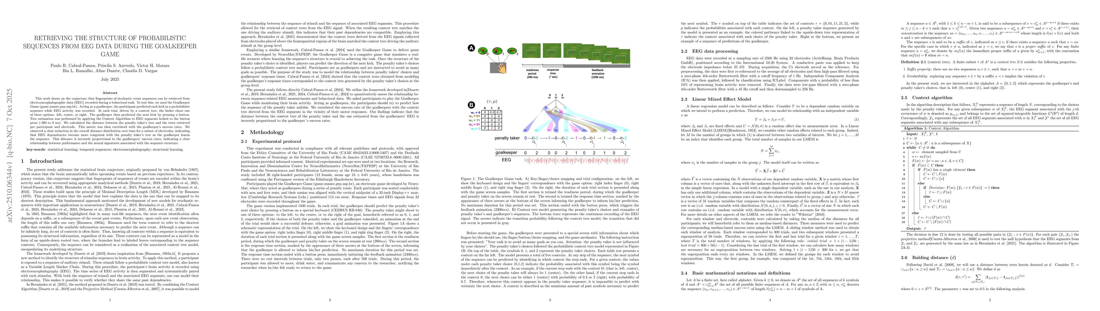 This work draws on the conjecture that fingerprints of stochastic event sequences can be retrieved from electroencephalographic data (EEG) recorded during a behavioral task. To test this, we used the Goalkeeper Game (game.numec.prp.usp.br). Acting as a goalkeeper, the participant predicted each kick in a probabilistic sequence while EEG activity was recorded. At each trial, driven by a context tree, the kicker chose one of three options: left, center, or right. The goalkeeper then predicted the next kick by pressing a button. Tree estimation was performed by applying the Context Algorithm to EEG segments locked to the button press (-300 to 0 ms). We calculated the distance between the penalty taker's tree and the trees retrieved per participant and electrode. This metric was then correlated with the goalkeeper's success rates. We observed a clear reduction in the overall distance distribution over time for a subset of electrodes, indicating that EEG dependencies become more congruent with the penalty taker's tree as the goalkeeper learns the sequence. This distance is inversely proportional to the goalkeepers' success rates, indicating a clear relationship between performance and the neural signatures associated with the sequence structure.