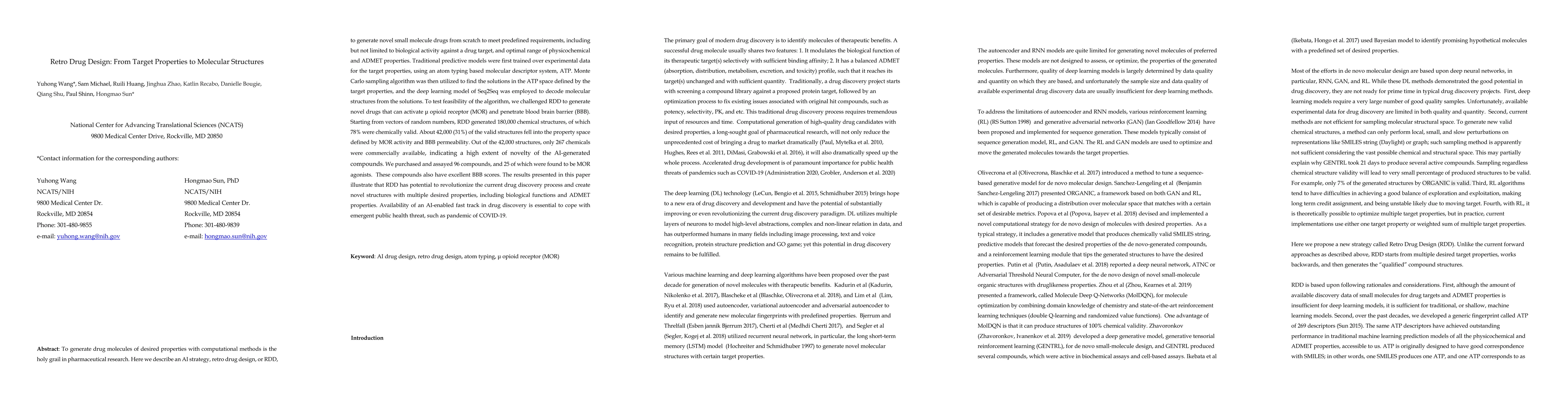 To generate drug molecules of desired properties with computational methods is the holy grail in pharmaceutical research. Here we describe an AI strategy, retro drug design, or RDD, to generate novel small molecule drugs from scratch to meet predefined requirements, including but not limited to biological activity against a drug target, and optimal range of physicochemical and ADMET properties. Traditional predictive models were first trained over experimental data for the target properties, using an atom typing based molecular descriptor system, ATP. Monte Carlo sampling algorithm was then utilized to find the solutions in the ATP space defined by the target properties, and the deep learning model of Seq2Seq was employed to decode molecular structures from the solutions. To test feasibility of the algorithm, we challenged RDD to generate novel drugs that can activate {\mu} opioid receptor (MOR) and penetrate blood brain barrier (BBB). Starting from vectors of random numbers, RDD generated 180,000 chemical structures, of which 78% were chemically valid. About 42,000 (31%) of the valid structures fell into the property space defined by MOR activity and BBB permeability. Out of the 42,000 structures, only 267 chemicals were commercially available, indicating a high extent of novelty of the AI-generated compounds. We purchased and assayed 96 compounds, and 25 of which were found to be MOR agonists. These compounds also have excellent BBB scores. The results presented in this paper illustrate that RDD has potential to revolutionize the current drug discovery process and create novel structures with multiple desired properties, including biological functions and ADMET properties. Availability of an AI-enabled fast track in drug discovery is essential to cope with emergent public health threat, such as pandemic of COVID-19.