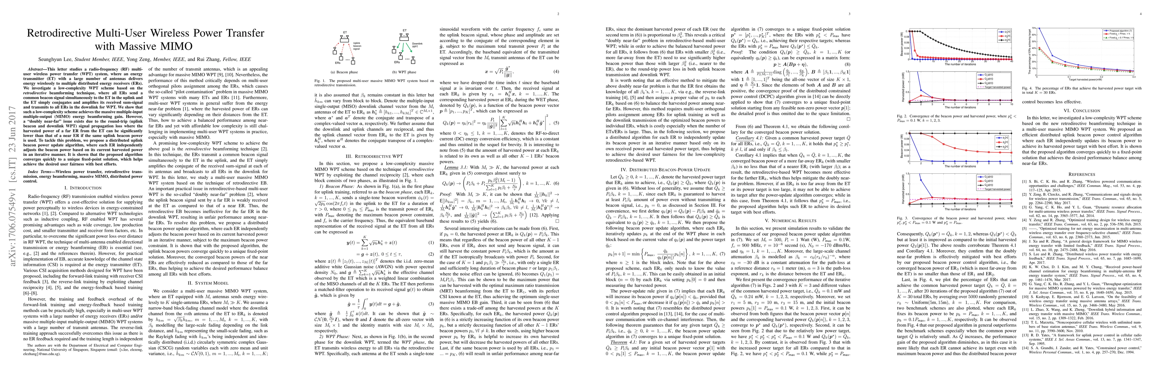 This paper proposes a low-complexity multi-user wireless power transfer system using retrodirective beamforming and massive MIMO, addressing the "doubly near-far" issue with a distributed uplink beacon power update algorithm to achieve user fairness. The scheme leverages massive MIMO gains but mitigates unequal power distribution through iterative beacon power adjustments.