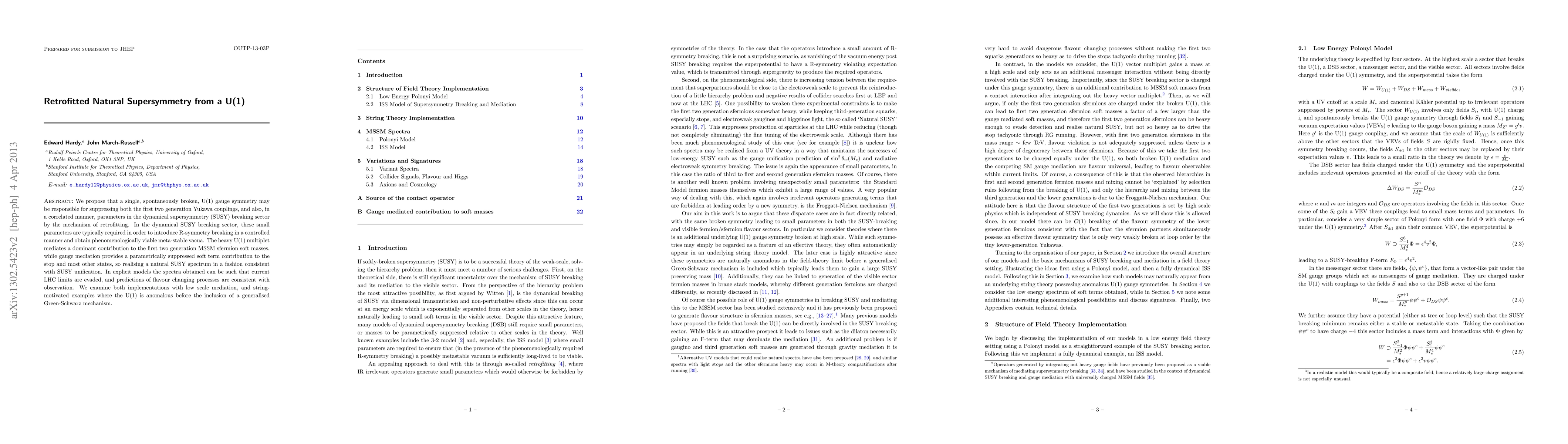 We propose that a single, spontaneously broken, U(1) gauge symmetry may be responsible for suppressing both the first two generation Yukawa couplings, and also, in a correlated manner, parameters in the dynamical supersymmetry (SUSY) breaking sector by the mechanism of retrofitting. In the dynamical SUSY breaking sector, these small parameters are typically required in order to introduce R-symmetry breaking in a controlled manner and obtain phenomenologically viable meta-stable vacua. The heavy U(1) multiplet mediates a dominant contribution to the first two generation MSSM sfermion soft masses, while gauge mediation provides a parametrically suppressed soft term contribution to the stop and most other states, so realising a natural SUSY spectrum in a fashion consistent with SUSY unification. In explicit models the spectra obtained can be such that current LHC limits are evaded, and predictions of flavour changing processes are consistent with observation. We examine both implementations with low scale mediation, and string-motivated examples where the U(1) is anomalous before the inclusion of a generalised Green-Schwarz mechanism.