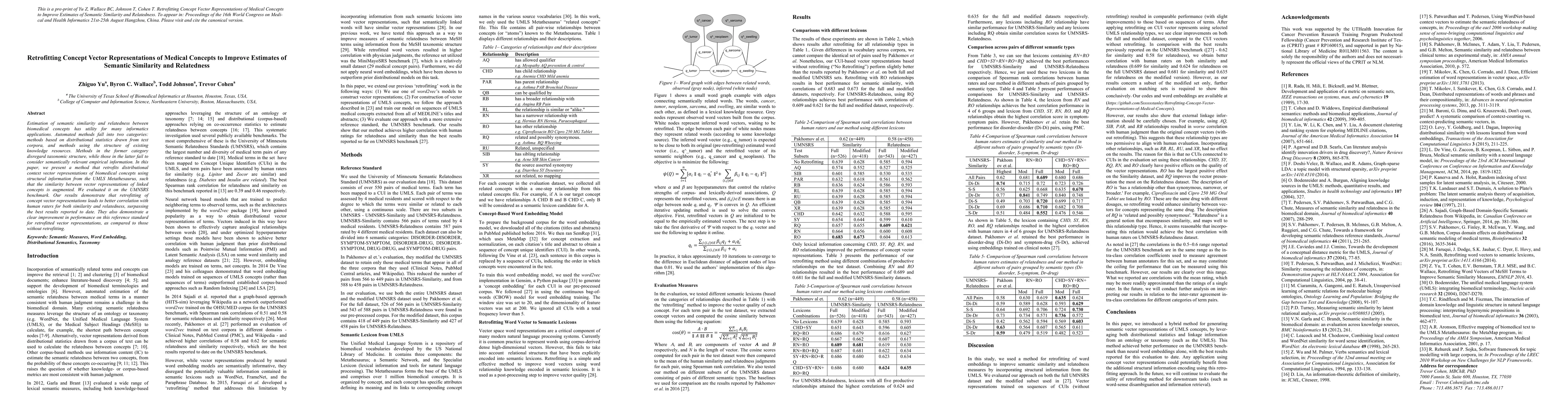 This paper proposes a method to enhance semantic similarity and relatedness estimates between biomedical concepts by retrofitting distributional vector representations with structural information from the UMLS Metathesaurus. The results show improved performance over existing methods, achieving better correlation with human raters and outperforming non-retrofitted vectors on a benchmark dataset.