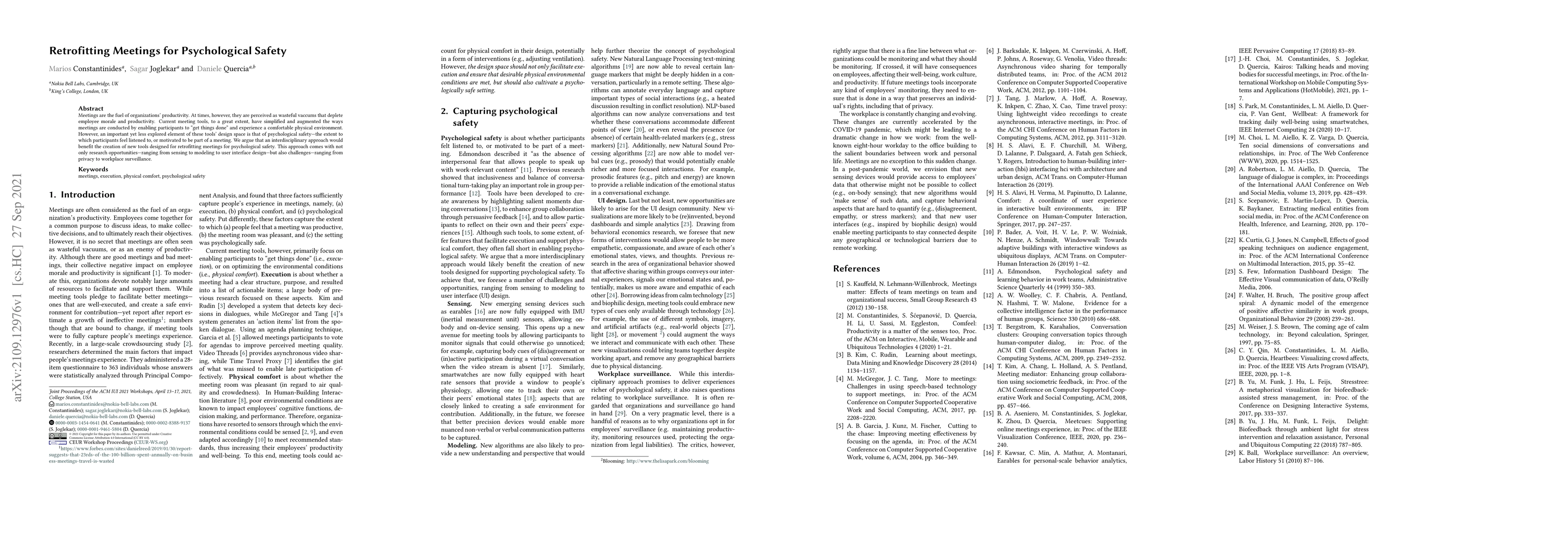 Meetings are the fuel of organizations' productivity. At times, however, they are perceived as wasteful vaccums that deplete employee morale and productivity. Current meeting tools, to a great extent, have simplified and augmented the ways meetings are conducted by enabling participants to ``get things done'' and experience a comfortable physical environment. However, an important yet less explored element of these tools' design space is that of psychological safety -- the extent to which participants feel listened to, or motivated to be part of a meeting. We argue that an interdisciplinary approach would benefit the creation of new tools designed for retrofitting meetings for psychological safety. This approach comes with not only research opportunities -- ranging from sensing to modeling to user interface design -- but also challenges -- ranging from privacy to workplace surveillance.